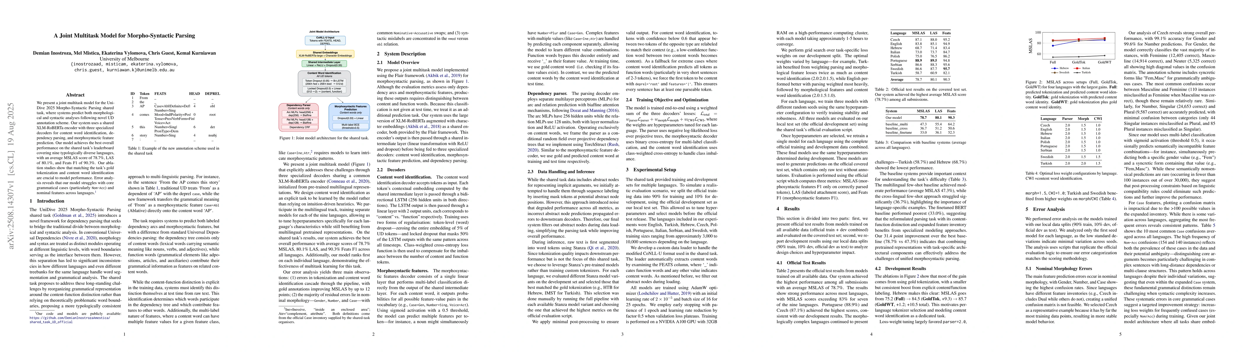 The research presents a joint multitask model for morpho-syntactic parsing using a shared XLM-RoBERTa encoder with three specialized decoders for content word identification, dependency parsing, and morphosyntactic feature prediction.