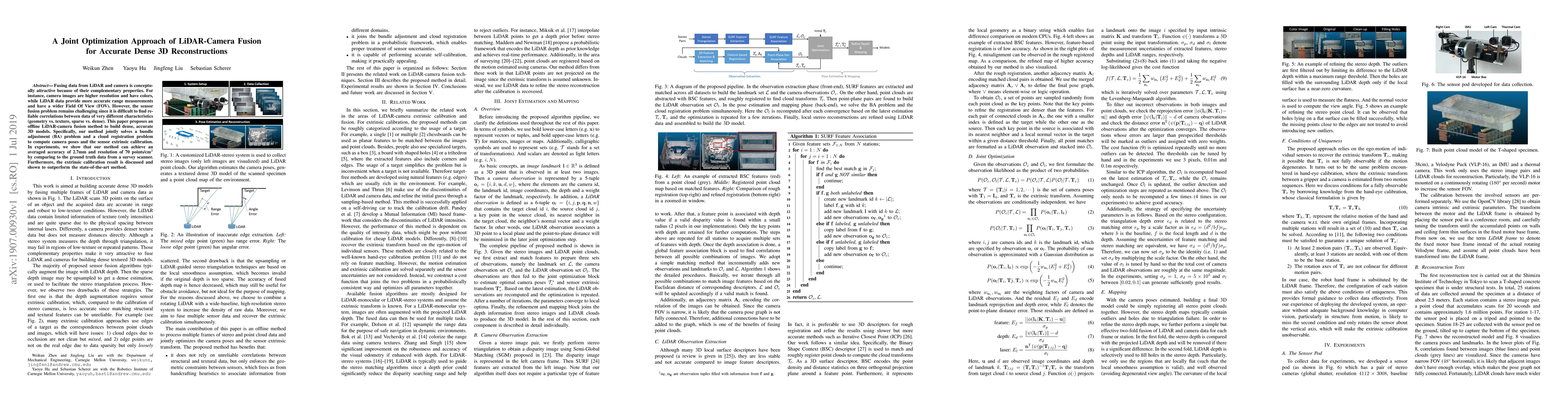 This paper presents a joint optimization method for LiDAR-camera fusion to achieve accurate dense 3D reconstructions, solving both bundle adjustment and cloud registration problems. Experimental results show an average accuracy of 2.7mm and a resolution of 70 points per square cm, outperforming state-of-the-art extrinsic calibration methods.
