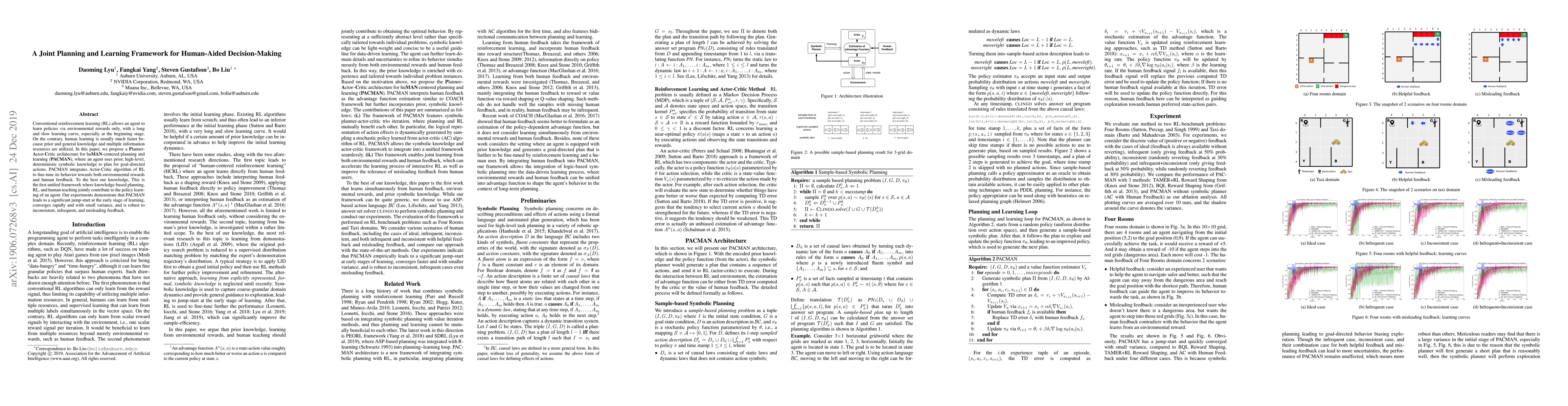 Conventional reinforcement learning (RL) allows an agent to learn policies via environmental rewards only, with a long and slow learning curve, especially at the beginning stage. On the contrary, human learning is usually much faster because prior and general knowledge and multiple information resources are utilized. In this paper, we propose a \textbf{P}lanner-\textbf{A}ctor-\textbf{C}ritic architecture for hu\textbf{MAN}-centered planning and learning (\textbf{PACMAN}), where an agent uses prior, high-level, deterministic symbolic knowledge to plan for goal-directed actions. PACMAN integrates Actor-Critic algorithm of RL to fine-tune its behavior towards both environmental rewards and human feedback. To the best our knowledge, This is the first unified framework where knowledge-based planning, RL, and human teaching jointly contribute to the policy learning of an agent. Our experiments demonstrate that PACMAN leads to a significant jump-start at the early stage of learning, converges rapidly and with small variance, and is robust to inconsistent, infrequent, and misleading feedback.