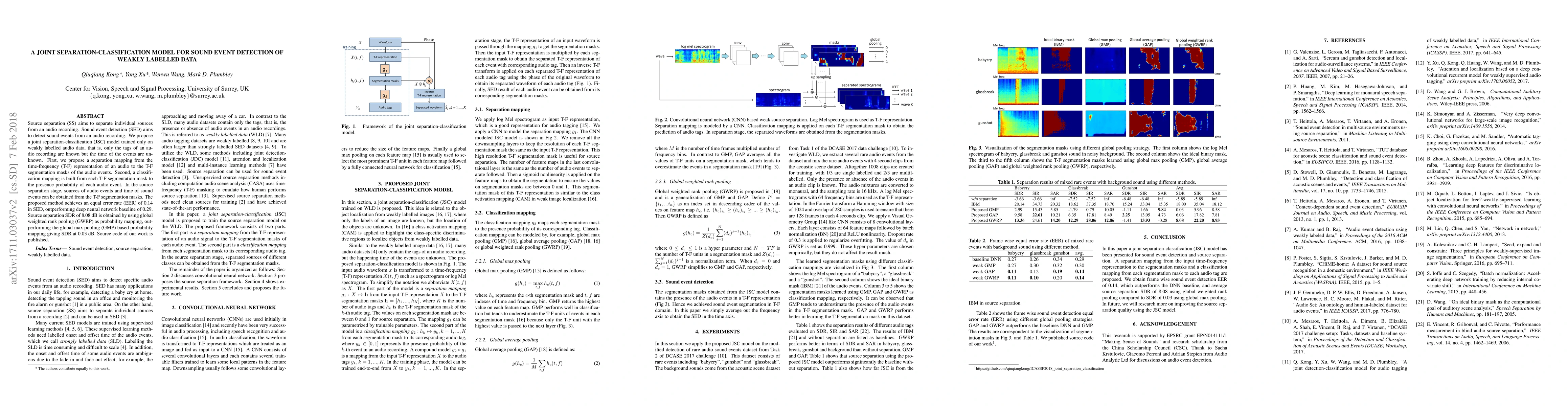 This paper presents a joint separation-classification (JSC) model for sound event detection (SED) using weakly labelled data. The proposed method separates audio sources and detects events through time-frequency segmentation masks, achieving an EER of 0.14, significantly outperforming a deep neural network baseline.