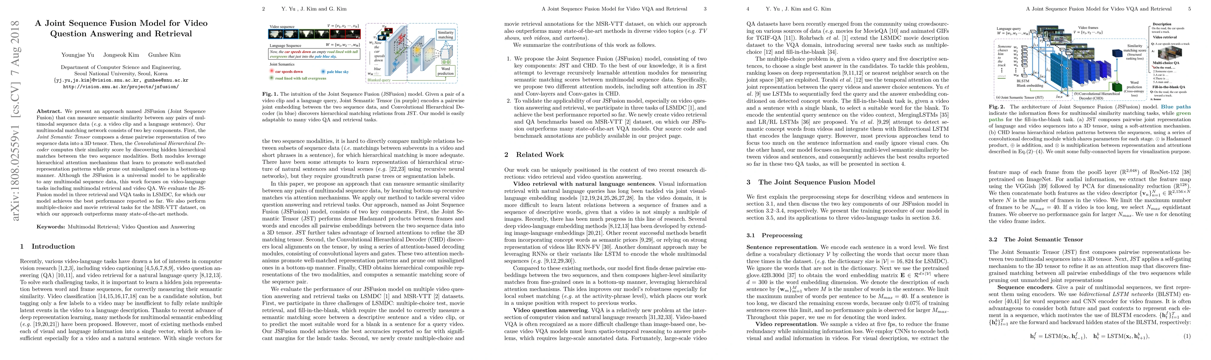 We present an approach named JSFusion (Joint Sequence Fusion) that can measure semantic similarity between any pairs of multimodal sequence data (e.g. a video clip and a language sentence). Our multimodal matching network consists of two key components. First, the Joint Semantic Tensor composes a dense pairwise representation of two sequence data into a 3D tensor. Then, the Convolutional Hierarchical Decoder computes their similarity score by discovering hidden hierarchical matches between the two sequence modalities. Both modules leverage hierarchical attention mechanisms that learn to promote well-matched representation patterns while prune out misaligned ones in a bottom-up manner. Although the JSFusion is a universal model to be applicable to any multimodal sequence data, this work focuses on video-language tasks including multimodal retrieval and video QA. We evaluate the JSFusion model in three retrieval and VQA tasks in LSMDC, for which our model achieves the best performance reported so far. We also perform multiple-choice and movie retrieval tasks for the MSR-VTT dataset, on which our approach outperforms many state-of-the-art methods.