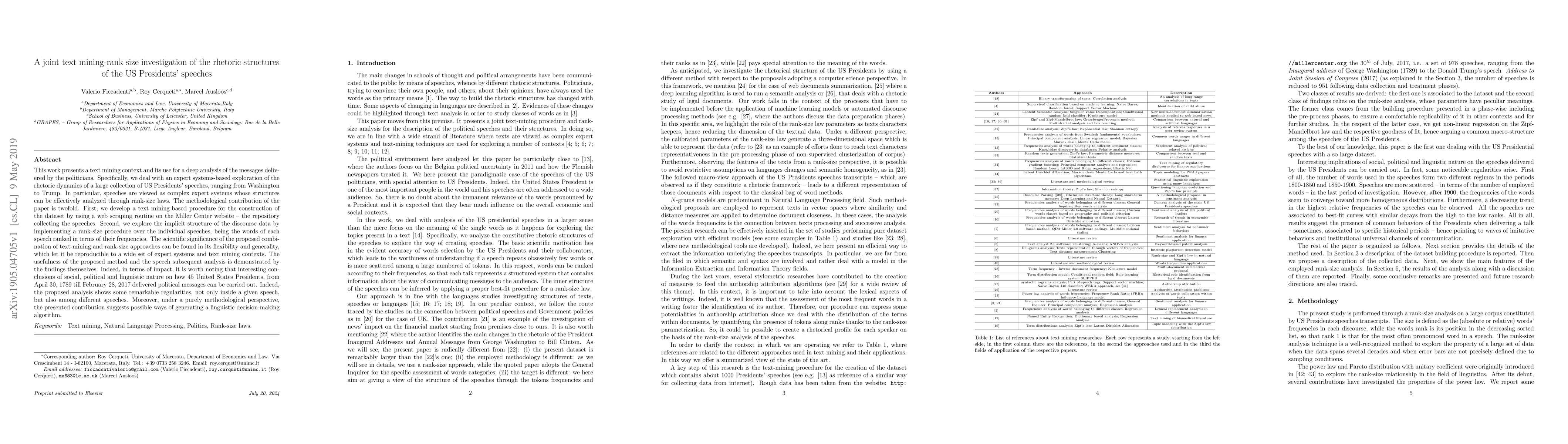 This work presents a text mining context and its use for a deep analysis of the messages delivered by the politicians. Specifically, we deal with an expert systems-based exploration of the rhetoric dynamics of a large collection of US Presidents' speeches, ranging from Washington to Trump. In particular, speeches are viewed as complex expert systems whose structures can be effectively analyzed through rank-size laws. The methodological contribution of the paper is twofold. First, we develop a text mining-based procedure for the construction of the dataset by using a web scraping routine on the Miller Center website -- the repository collecting the speeches. Second, we explore the implicit structure of the discourse data by implementing a rank-size procedure over the individual speeches, being the words of each speech ranked in terms of their frequencies. The scientific significance of the proposed combination of text-mining and rank-size approaches can be found in its flexibility and generality, which let it be reproducible to a wide set of expert systems and text mining contexts. The usefulness of the proposed method and the speech subsequent analysis is demonstrated by the findings themselves. Indeed, in terms of impact, it is worth noting that interesting conclusions of social, political and linguistic nature on how 45 United States Presidents, from April 30, 1789 till February 28, 2017 delivered political messages can be carried out. Indeed, the proposed analysis shows some remarkable regularities, not only inside a given speech, but also among different speeches. Moreover, under a purely methodological perspective, the presented contribution suggests possible ways of generating a linguistic decision-making algorithm.