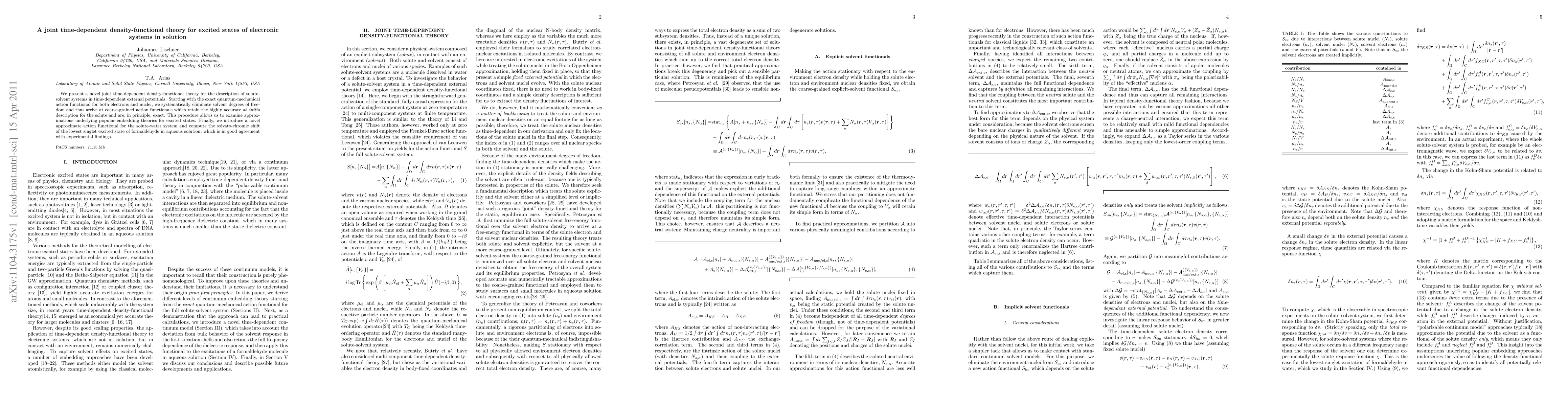 This paper proposes a new joint time-dependent density-functional theory to accurately describe solute-solvent interactions under external potentials. It develops an approximate action functional that effectively captures the solvato-chromic shift of formaldehyde's lowest excited state in water, aligning well with experimental data.