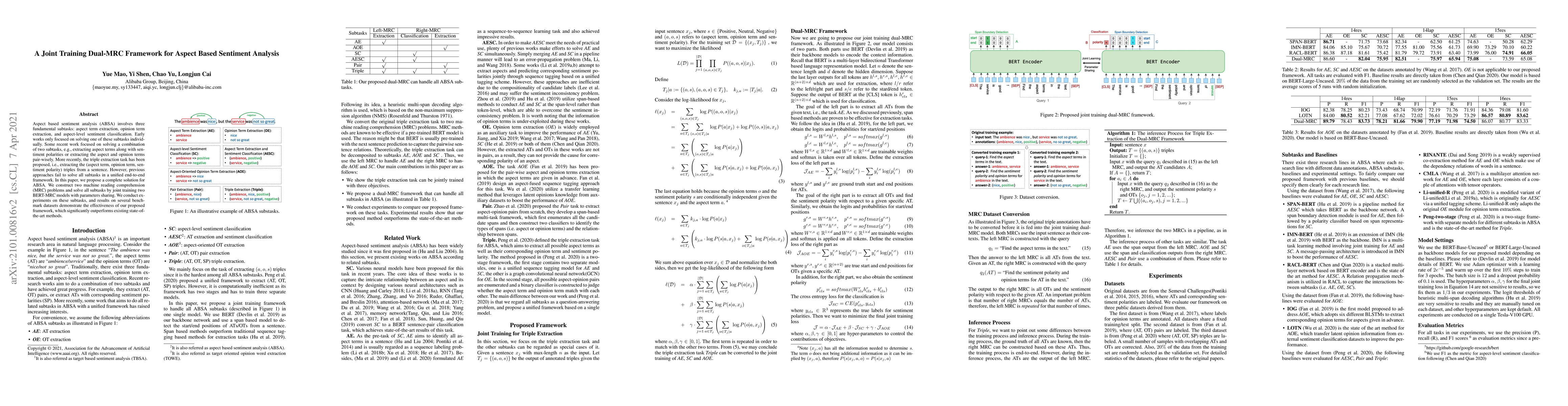 This paper proposes a joint training dual-MRC framework for aspect based sentiment analysis, addressing aspect term extraction, opinion term extraction, and aspect-level sentiment classification through a unified end-to-end solution. The method employs two BERT-MRC models sharing parameters, achieving superior performance over existing methods on benchmark datasets.