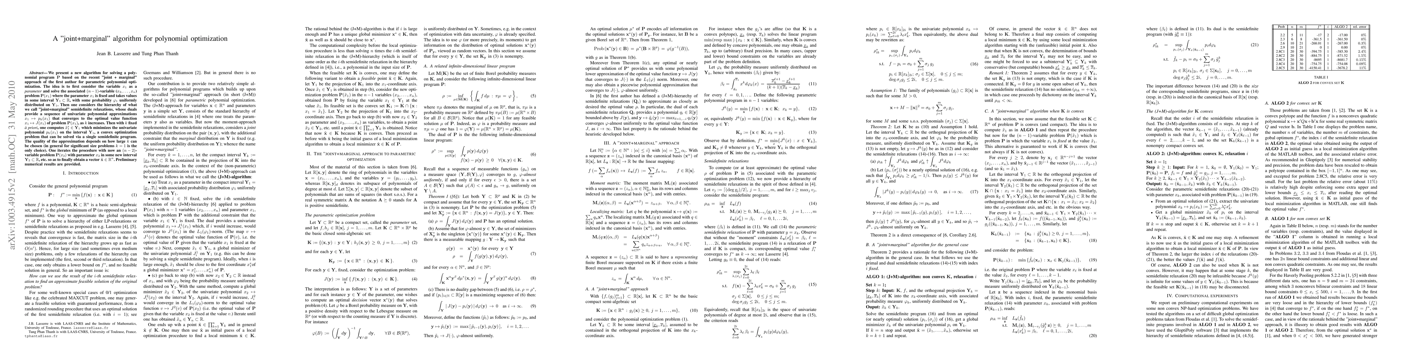 We present a new algorithm for solving a polynomial program P based on the recent "joint + marginal" approach of the first author for, parametric optimization. The idea is to first consider the variable x1 as a parameter and solve the associated (n-1)-variable (x2,...,xn) problem P(x1) where the parameter x1 is fixed and takes values in some interval Y1 with some probability uniformly distributed on Y1. Then one considers the hierarchy of what we call "joint+marginal" semidefinite relaxations, whose duals provide a sequence of univariate polynomial approximations that converges to the optimal value function J(x1) of problem P(x1), as k increases. Then with k fixed a priori, one computes a minimizer of the univariate polynomial pk(x1) on the interval Y1, which reduces to solving a single semidefinite program. One iterates the procedure with now an (n-2)-variable problem P(x2) with parameter x2 in some new interval Y2, etc. The quality of the approximation depends on how large k can be chosen (in general for significant size problems, k=1 is the only choice). Preliminary numerical results are provided