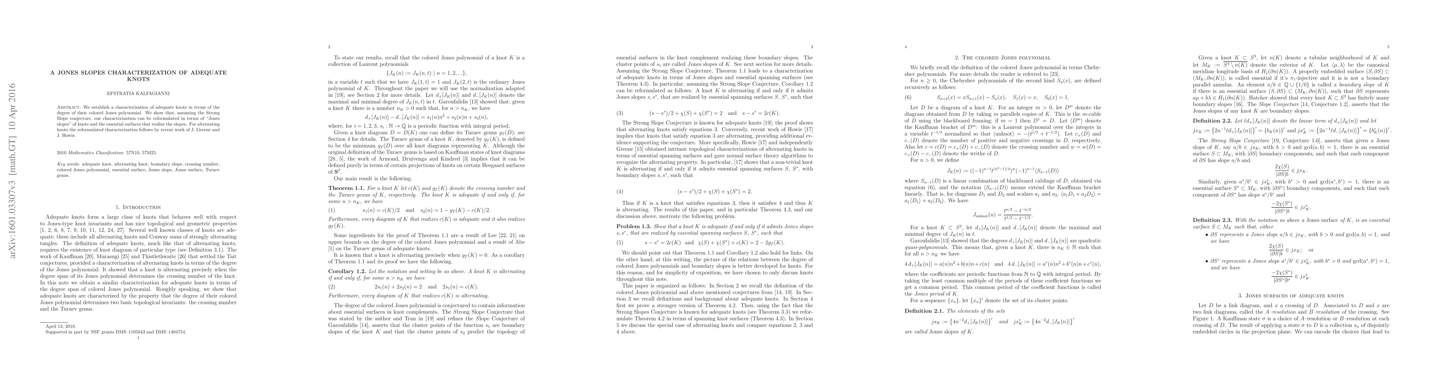We establish a characterization of adequate knots in terms of the degree of their colored Jones polynomial. We show that, assuming the Strong Slope conjecture, our characterization can be reformulated in terms of "Jones slopes" of knots and the essential surfaces that realize the slopes .For alternating knots the reformulated characterization follows by recent work of J. Greene and J. Howie.
