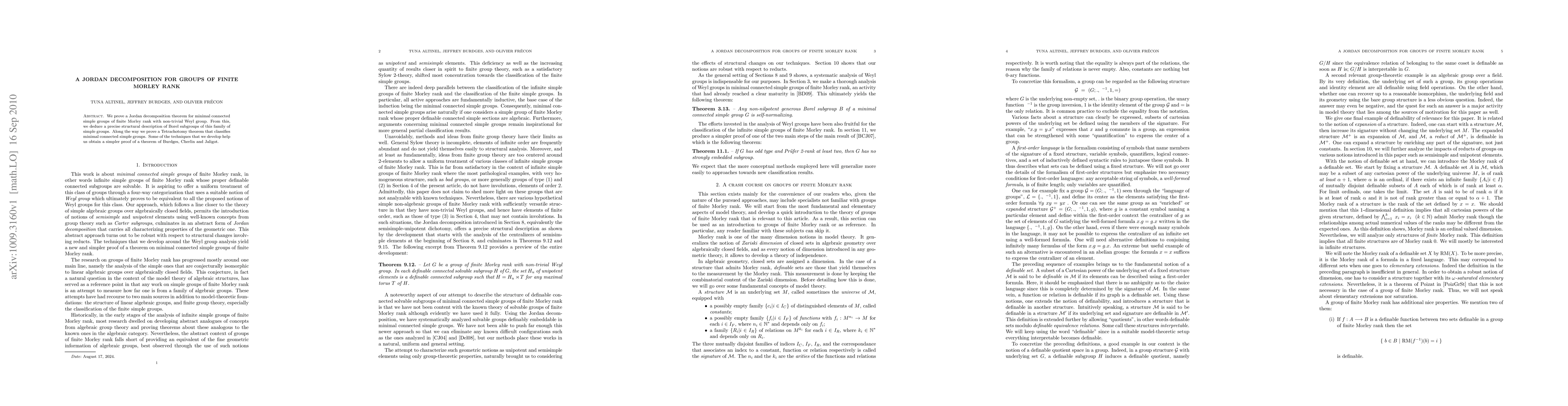 This paper proves a Jordan decomposition theorem for minimal connected simple groups of finite Morley rank with non-trivial Weyl groups, leading to a structural description of their Borel subgroups. It also introduces a Tetrachotomy theorem classifying these groups and simplifies a prior theorem by Burdges, Cherlin, and Jaligot.