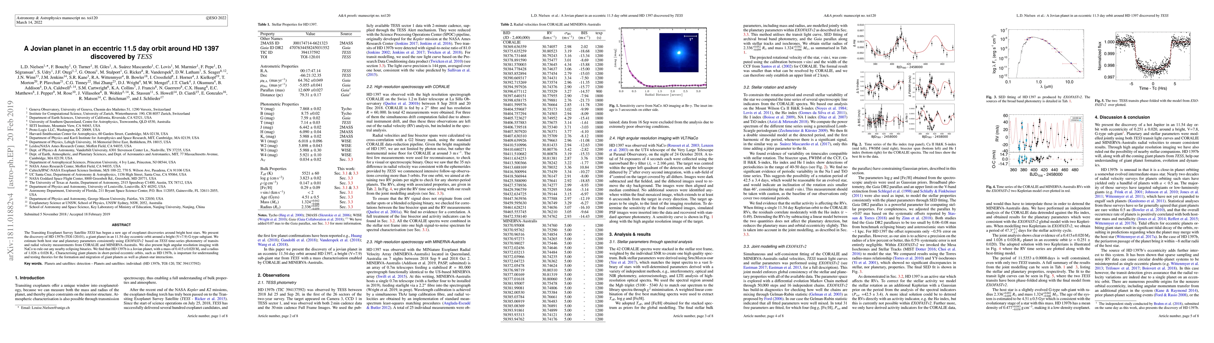 The TESS satellite discovered HD 1397b, a Jovian planet in an eccentric 11.54-day orbit around a G-type subgiant star. Characterized using EXOFASTv2 and radial velocity data, HD 1397b has a mass and radius consistent with Jupiter, highlighting its importance for studying planet formation and migration theories.
