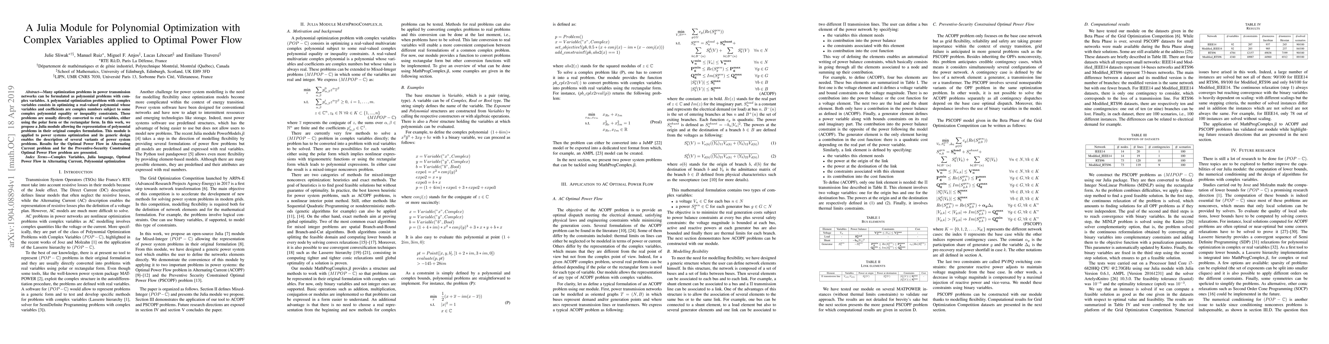 Many optimization problems in power transmission networks can be formulated as polynomial problems with complex variables. A polynomial optimization problem with complex variables consists in optimizing a real-valued polynomial whose variables and coefficients are complex numbers subject to some complex polynomial equality or inequality constraints. These problems are usually directly converted to real variables, either using the polar form or the rectangular form. In this work, we propose a Julia module allowing the representation of polynomial problems in their original complex formulation. This module is applied to power systems optimization and its generic design enables the description of several variants of power system problems. Results for the Optimal Power Flow in Alternating Current problem and for the Preventive-Security Constrained Optimal Power Flow problem are presented.