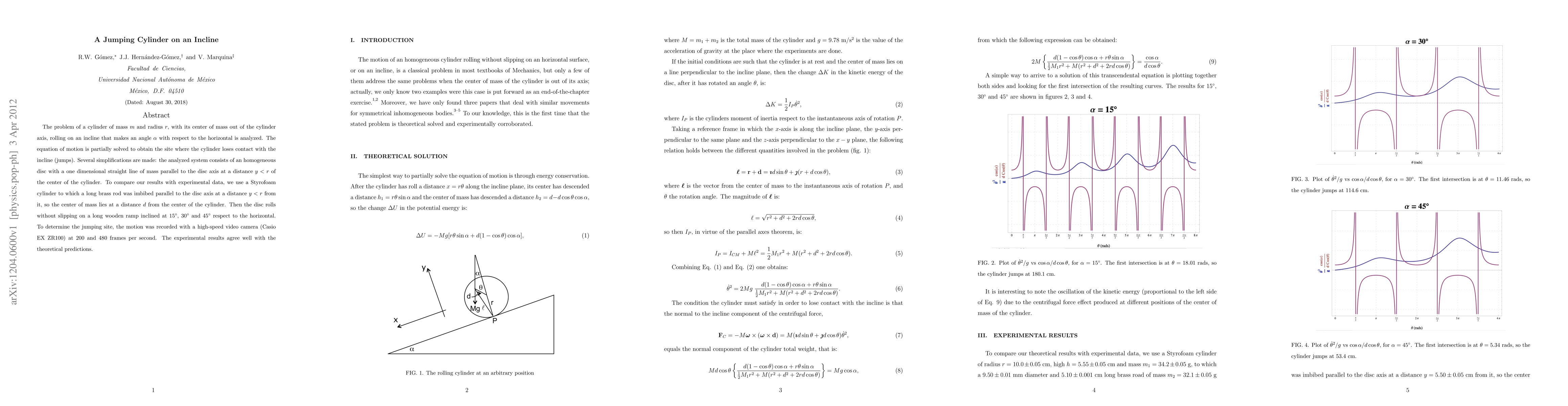 The paper investigates the motion of a cylinder with its center of mass offset, rolling on an inclined plane, and determines the jumping point through theoretical analysis and high-speed video recordings. Experimental validation using a modified Styrofoam cylinder shows good agreement with theoretical predictions.
