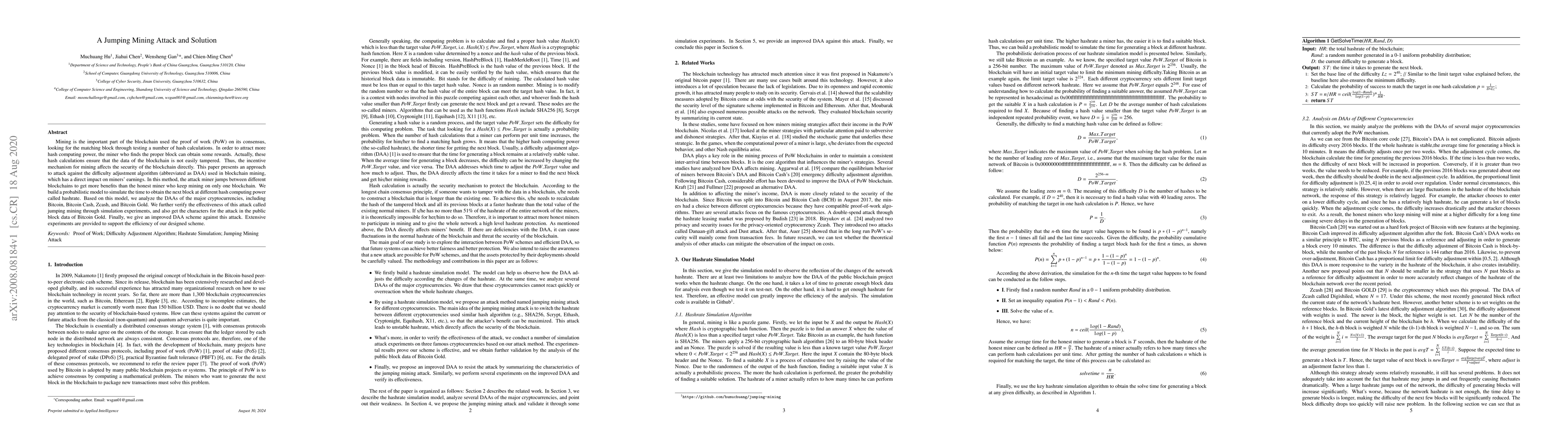 Researchers propose a new attack called jumping mining that exploits weaknesses in blockchain difficulty adjustment algorithms to gain an advantage over honest miners. They also present an improved scheme to mitigate this attack.