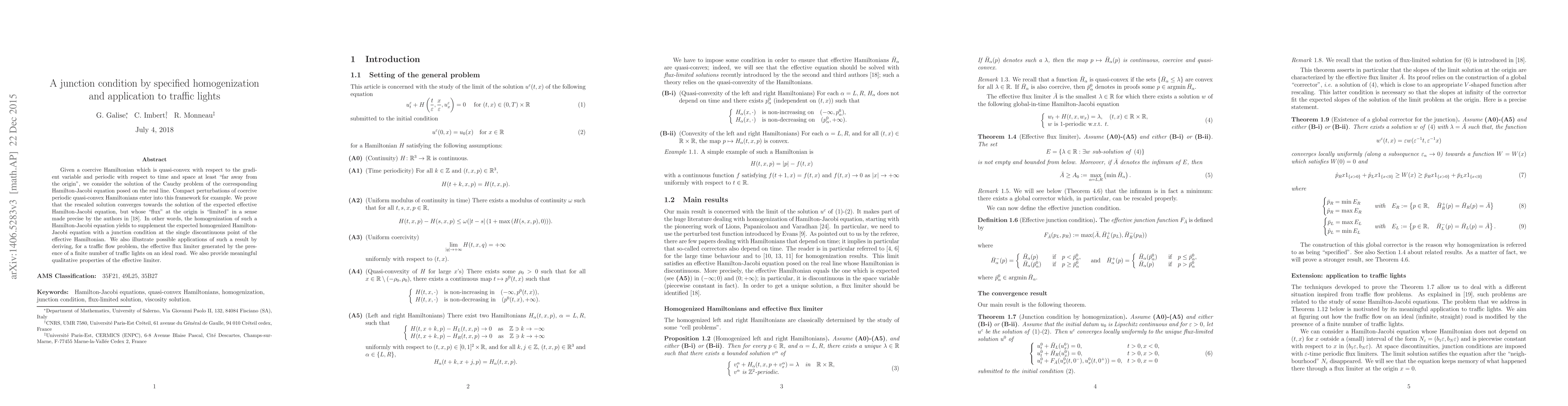 This paper presents a method to homogenize Hamilton-Jacobi equations with periodic, quasi-convex Hamiltonians, revealing a junction condition at discontinuities. The approach is illustrated with traffic flow problems, demonstrating how traffic lights influence effective flux limits, offering valuable qualitative properties of these limits.
