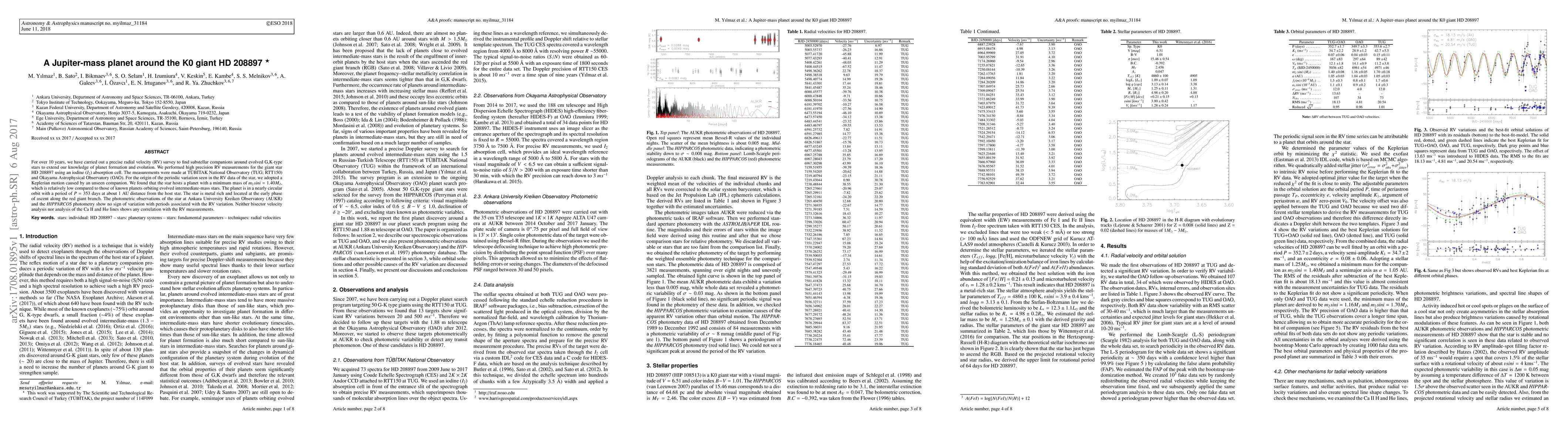 This study reports the discovery of a Jupiter-mass planet with a minimum mass of 1.40 MJ orbiting the K0 giant star HD 208897, identified through high-precision radial velocity measurements. The planet resides in a nearly circular orbit with a period of 353 days, approximately 1 AU from the star.