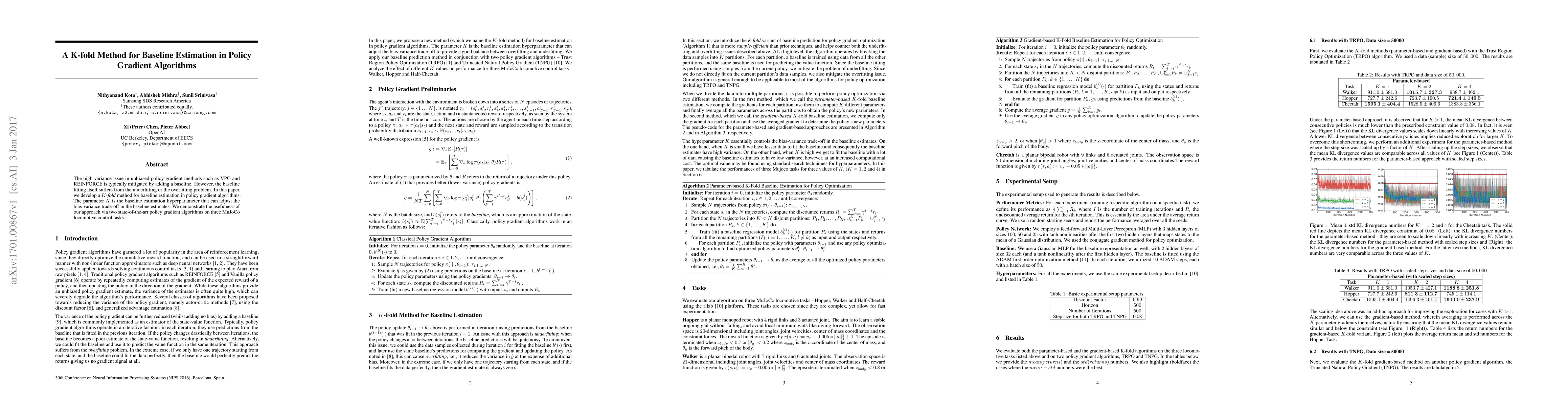This paper introduces a K-fold method to improve baseline estimation in policy gradient algorithms, addressing the bias-variance trade-off. The proposed approach adjusts the baseline fitting through hyperparameter K and is demonstrated on three MuJoCo tasks using two state-of-the-art algorithms.