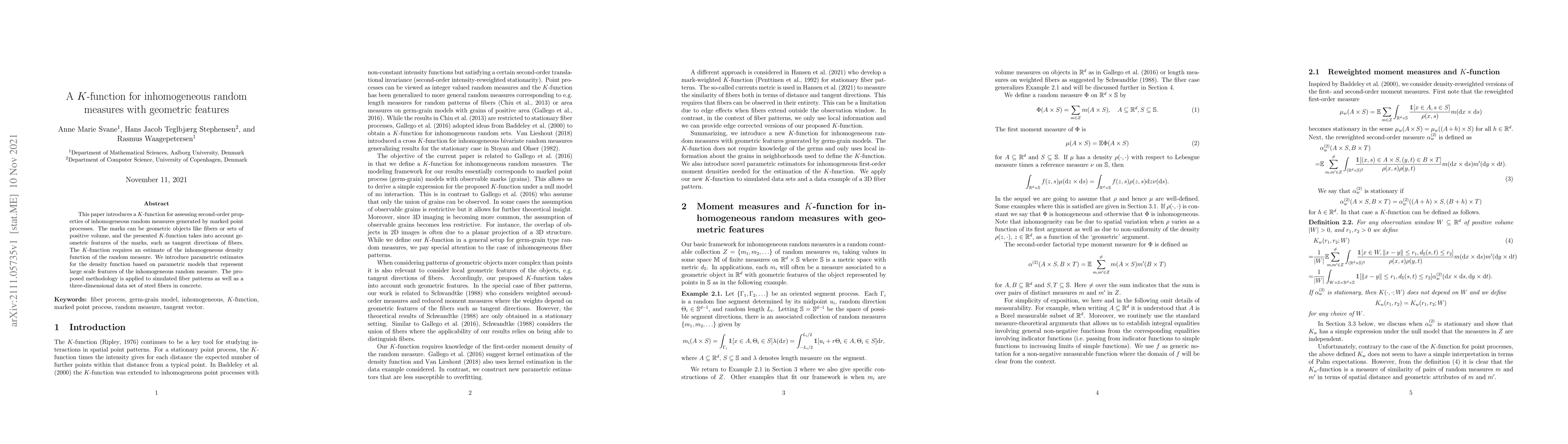 This paper introduces a K-function to analyze second-order properties of inhomogeneous random measures with geometric features, providing a new approach for assessing fiber patterns and materials characteristics.