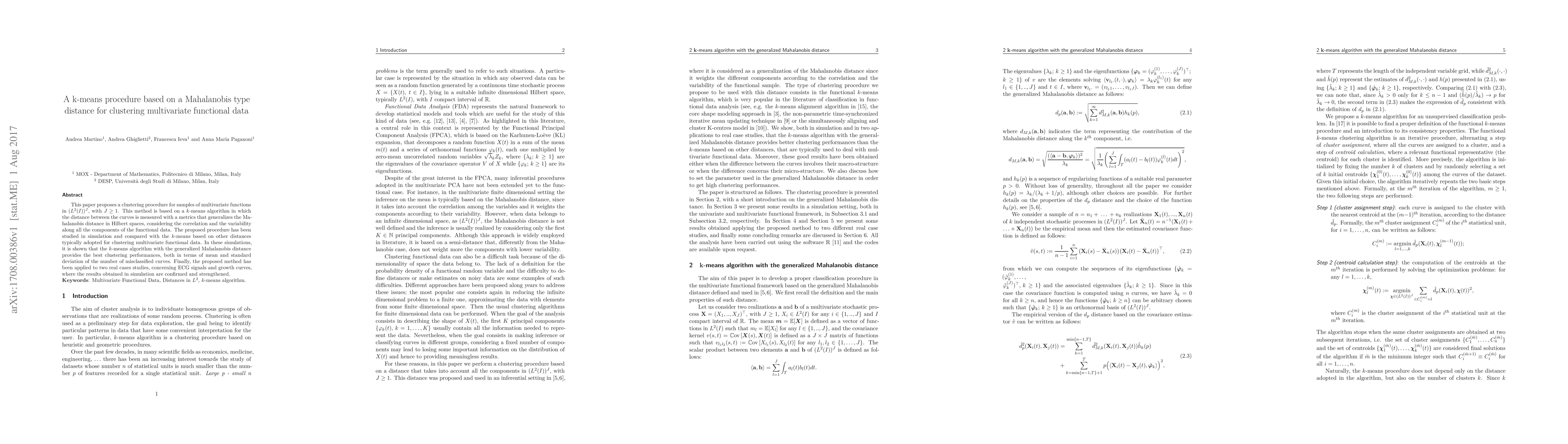 This paper introduces a k-means clustering method for multivariate functional data using a Mahalanobis type distance that accounts for correlation and variability. Simulation results show superior performance compared to other distance-based k-means methods, and the method is successfully applied to real-world ECG signals and growth curves.