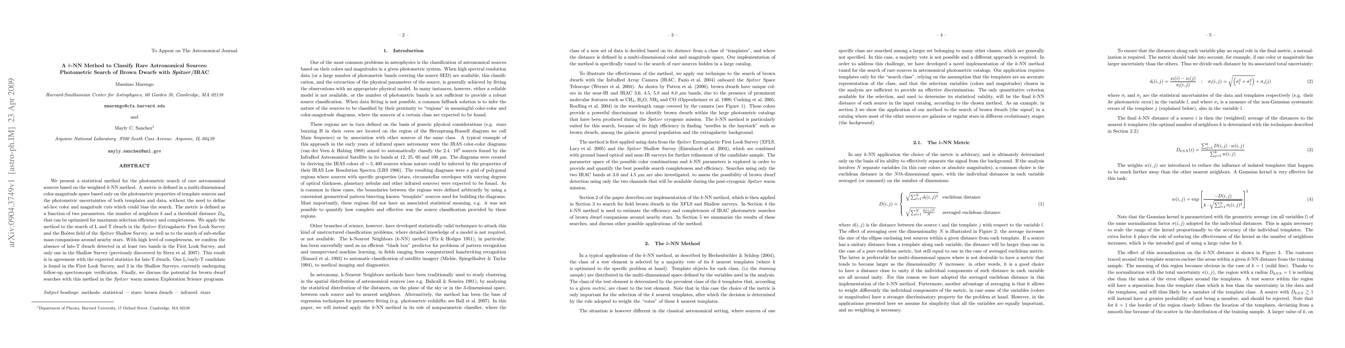 We present a statistical method for the photometric search of rare astronomical sources based on the weighted k-NN method. A metric is defined in a multi-dimensional color-magnitude space based only on the photometric properties of template sources and the photometric uncertainties of both templates and data, without the need to define ad-hoc color and magnitude cuts which could bias the search. The metric is defined as a function of two parameters, the number of neighbors k and a threshold distance D_th that can be optimized for maximum selection efficiency and completeness. We apply the method to the search of L and T dwarfs in the Spitzer Extragalactic First Look Survey and the Bootes field of the Spitzer Shallow Survey, as well as to the search of sub-stellar mass companions around nearby stars. With high level of completeness, we confirm the absence of late-T dwarfs detected in at least two bands in the First Look Survey, and only one in the Shallow Survey (previously discovered by Stern et al. 2007). This result is in agreement with the expected statistics for late-T dwarfs. One L/early-T candidate is found in the First Look Survey, and 3 in the Shallow Surveys, currently undergoing follow-up spectroscopic verification. Finally, we discuss the potential for brown dwarf searches with this method in the Spitzer warm mission Exploration Science programs.