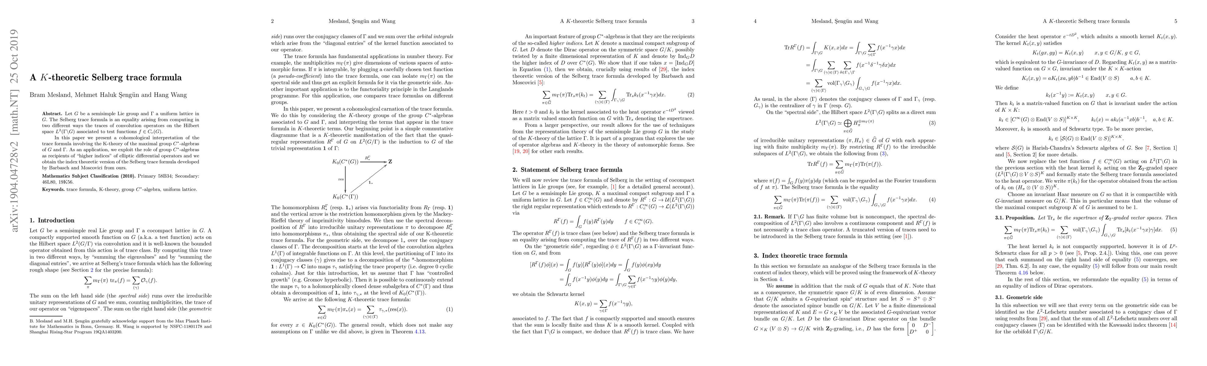 This paper provides a cohomological interpretation of the Selberg trace formula using K-theory of maximal group C*-algebras for a semisimple Lie group and its lattice. It also develops an index theoretic version of the Selberg trace formula, extending prior work by Barbasch and Moscovici.