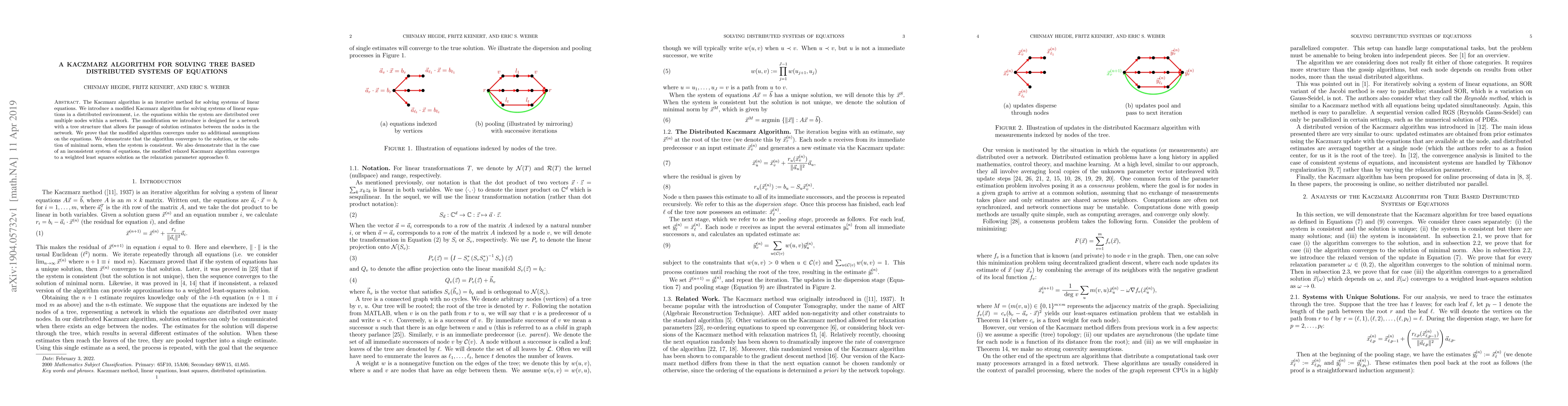 This paper presents a modified Kaczmarz algorithm for solving distributed systems of linear equations in a tree-structured network, proving its convergence under minimal assumptions. The algorithm converges to the minimal norm solution for consistent systems and to a weighted least squares solution for inconsistent systems as the relaxation parameter approaches zero.