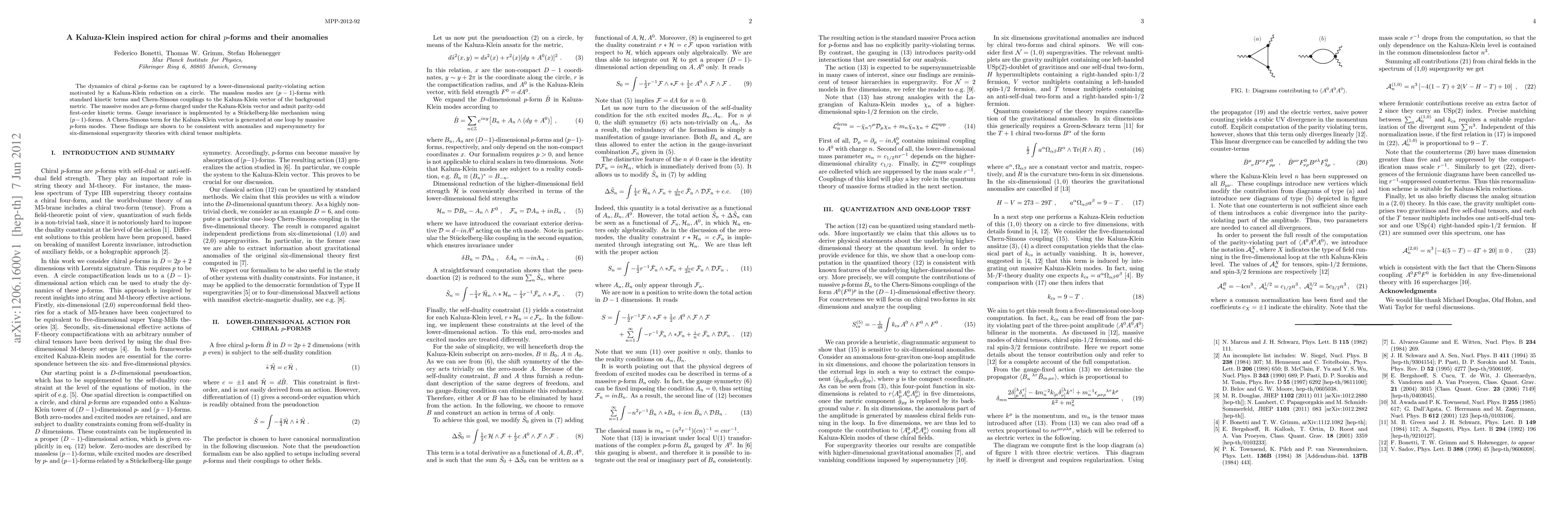 The dynamics of chiral p-forms can be captured by a lower-dimensional parity-violating action motivated by a Kaluza-Klein reduction on a circle. The massless modes are (p-1)-forms with standard kinetic terms and Chern-Simons couplings to the Kaluza-Klein vector of the background metric. The massive modes are p-forms charged under the Kaluza-Klein vector and admit parity-odd first-order kinetic terms. Gauge invariance is implemented by a Stueckelberg-like mechanism using (p-1)-forms. A Chern-Simons term for the Kaluza-Klein vector is generated at one loop by massive p-form modes. These findings are shown to be consistent with anomalies and supersymmetry for six-dimensional supergravity theories with chiral tensor multiplets.