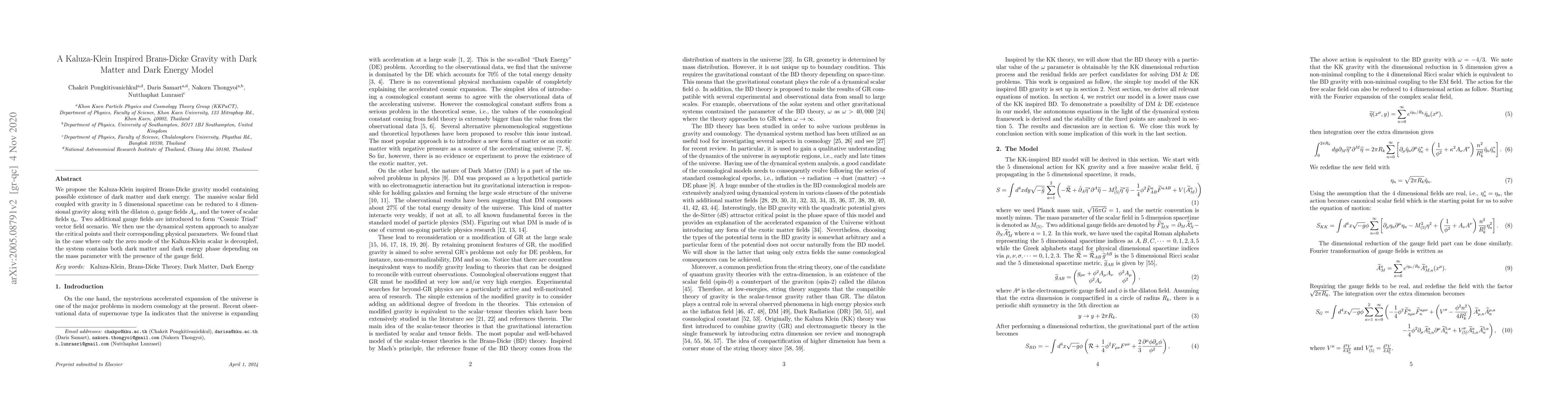 This paper proposes a Kaluza-Klein inspired Brans-Dicke gravity model incorporating dark matter and dark energy, reducing a 5D spacetime to 4D with a scalar field, dilaton, gauge fields, and a scalar field tower. The model introduces a "Cosmic Triad" vector field, and uses dynamical systems to analyze critical points, revealing a dual phase of dark matter and dark energy contingent on the mass parameter and gauge field presence.