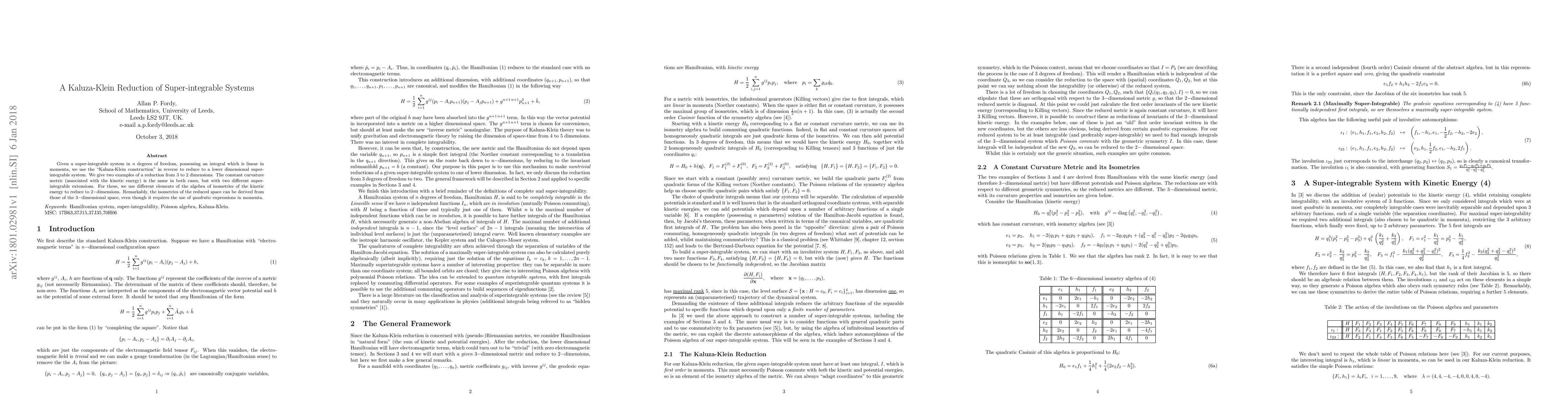 Given a super-integrable system in $n$ degrees of freedom, possessing an integral which is linear in momenta, we use the "Kaluza-Klein construction" in reverse to reduce to a lower dimensional super-integrable system. We give two examples of a reduction from 3 to 2 dimensions. The constant curvature metric (associated with the kinetic energy) is the same in both cases, but with two different super-integrable extensions. For these, we use different elements of the algebra of isometries of the kinetic energy to reduce to $2-$dimensions. Remarkably, the isometries of the reduced space can be derived from those of the $3-$dimensional space, even though it requires the use of {\em quadratic} expressions in momenta.