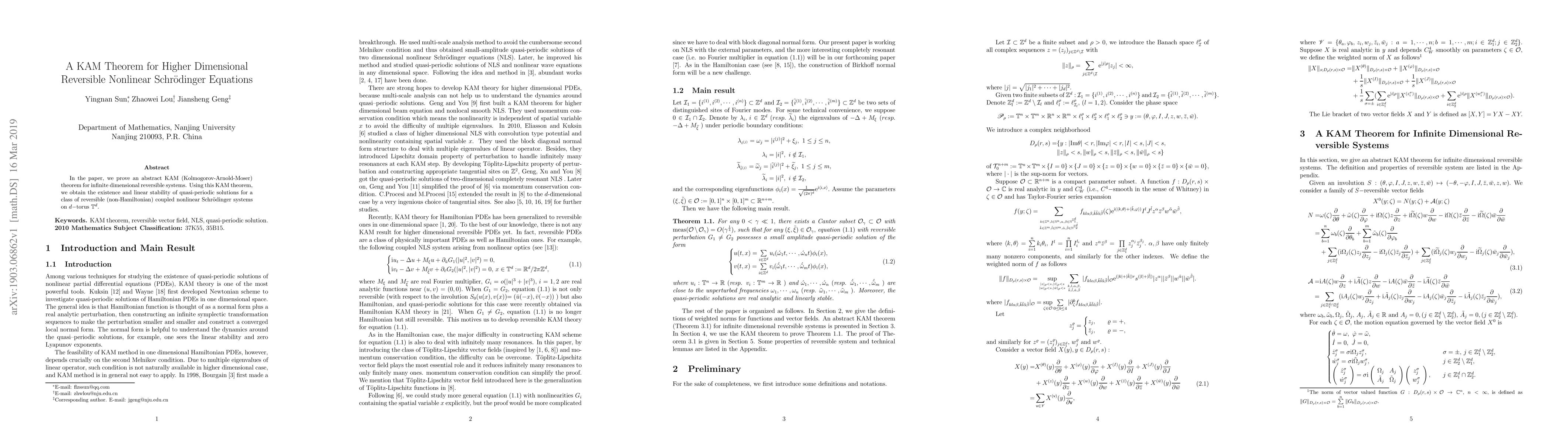 This paper proves an abstract KAM theorem for infinite dimensional reversible systems, establishing the existence and linear stability of quasi-periodic solutions for reversible nonlinear Schrödinger equations on a $d$-torus $\mathbb{T}^d$.