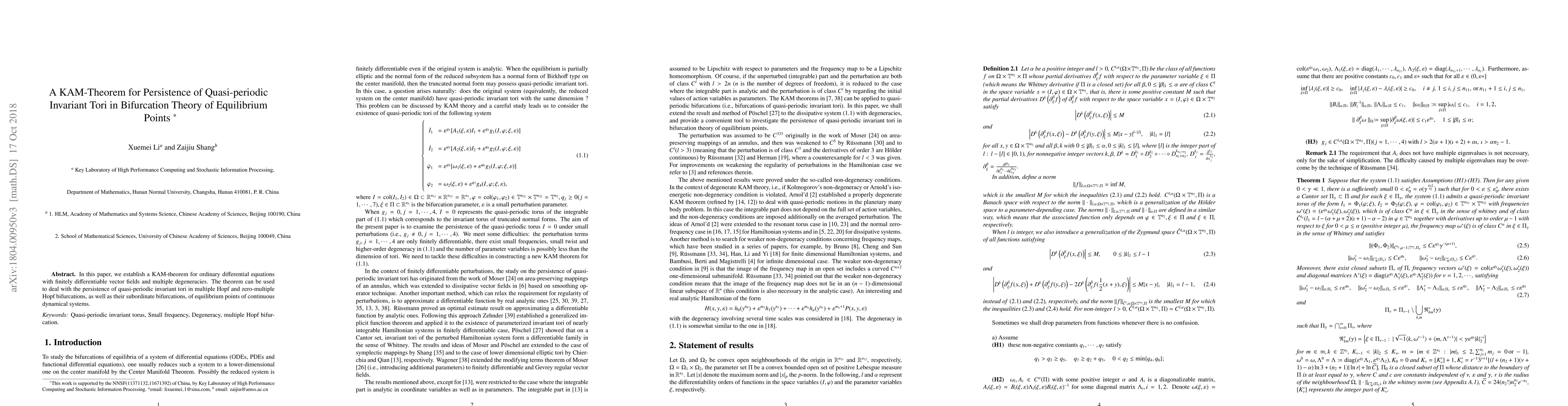 In this paper, we establish a KAM-theorem for ordinary differential equations with finitely differentiable vector fields and multiple degeneracies. The theorem can be used to deal with the persistence of quasi-periodic invariant tori in multiple Hopf and zero-multiple Hopf bifurcations, as well as their subordinate bifurcations, of equilibrium points of continuous dynamical systems.