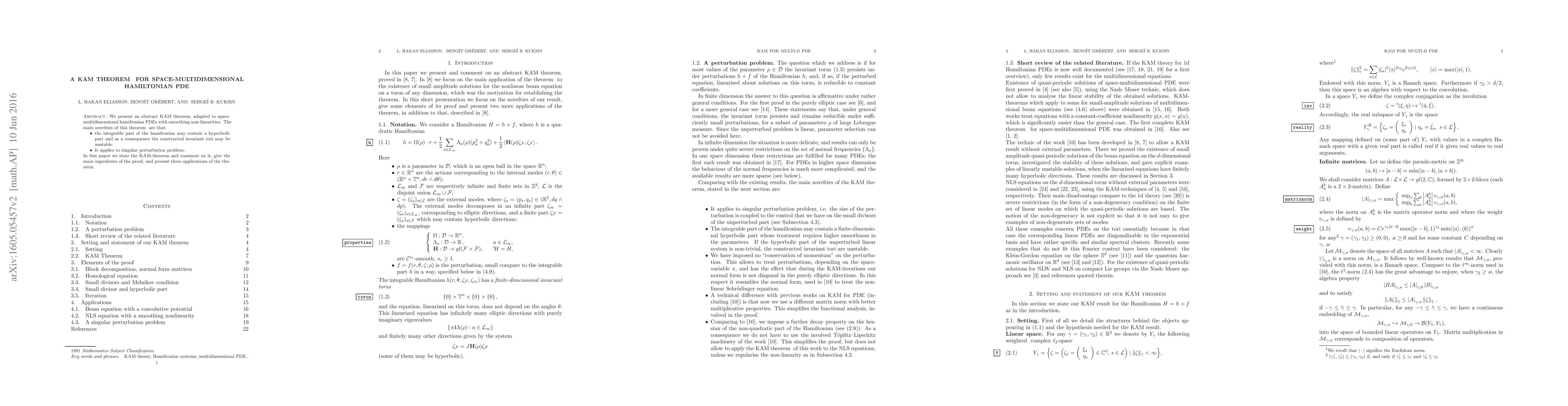 We present an abstract KAM theorem, adapted to space-multidimensional hamiltonian PDEs with smoothing non-linearities. The main novelties of this theorem are that: $\bullet$ the integrable part of the hamiltonian may contain a hyperbolic part and as a consequence the constructed invariant tori may be unstable. $\bullet$ It applies to singular perturbation problem. In this paper we state the KAM-theorem and comment on it, give the main ingredients of the proof, and present three applications of the theorem .