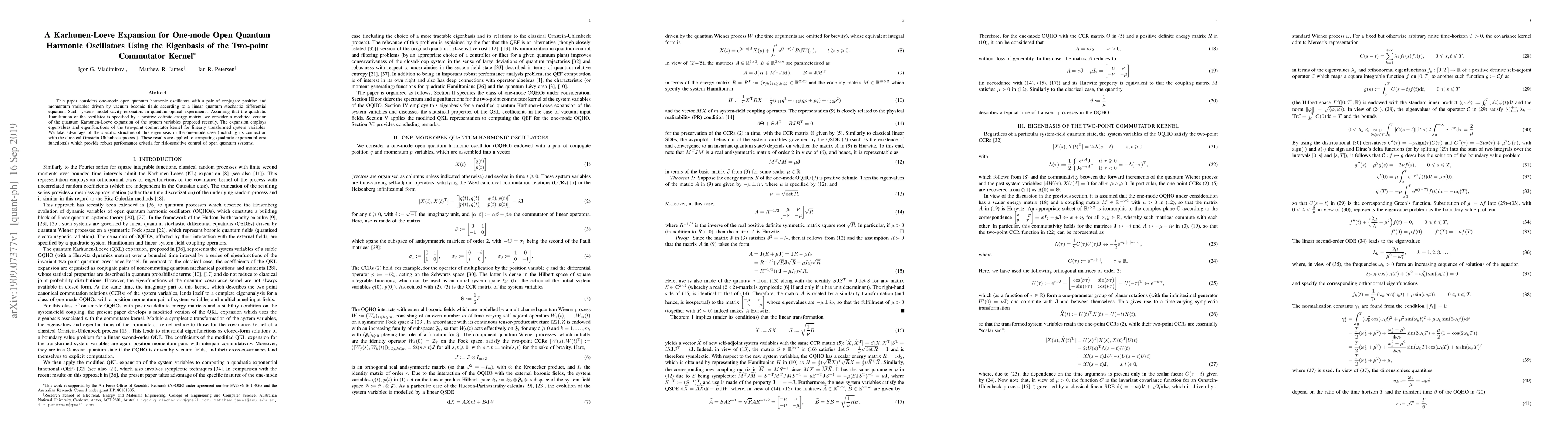 This paper develops a Karhunen-Loeve expansion for one-mode open quantum harmonic oscillators, utilizing the eigenbasis of the two-point commutator kernel. The results are applied to compute quadratic-exponential cost functionals for risk-sensitive control of these quantum systems.