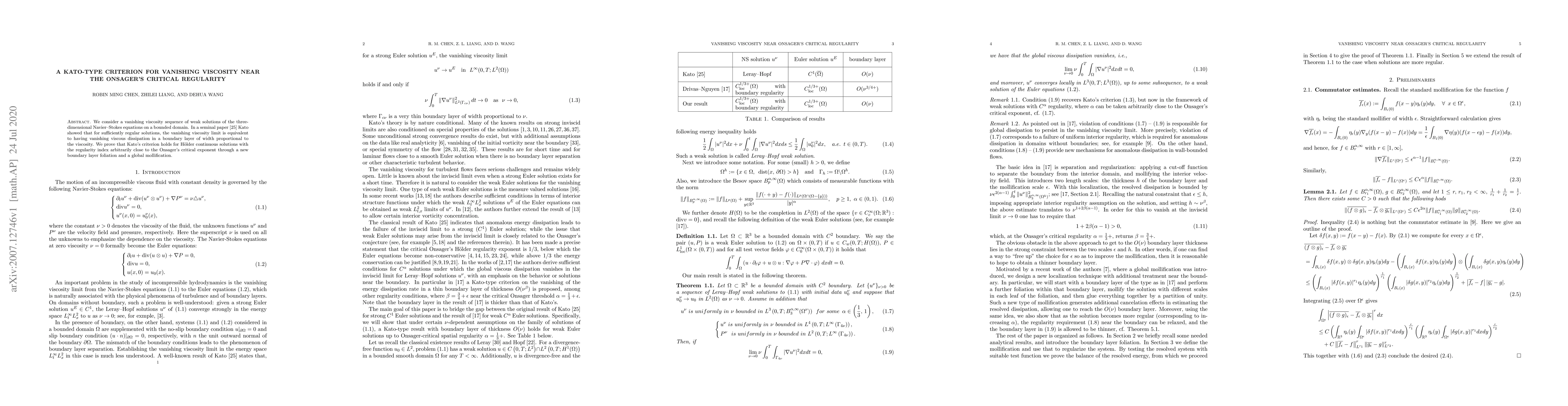 We consider a vanishing viscosity sequence of weak solutions of the three-dimensional Navier--Stokes equations on a bounded domain. In a seminal paper [25] Kato showed that for sufficiently regular solutions, the vanishing viscosity limit is equivalent to having vanishing viscous dissipation in a boundary layer of width proportional to the viscosity. We prove that Kato's criterion holds for H\"older continuous solutions with the regularity index arbitrarily close to the Onsager's critical exponent through a new boundary layer foliation and a global mollification.