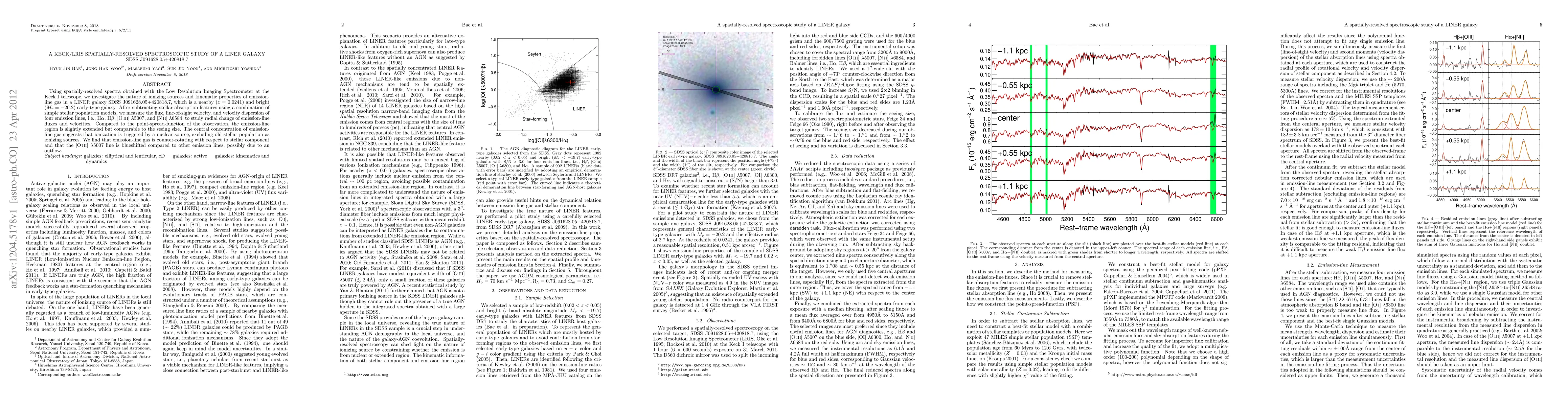 This study uses Keck telescope data to analyze a nearby LINER galaxy, SDSS J091628.05+420818.7. By removing stellar absorption, the researchers measured emission line fluxes and velocities, revealing an extended but seeing-sized emission-line region. Ionization is likely from a nuclear source, not old stars. The gas counter-rotates with respect to the stellar component and shows a blueshift in [O III] 5007, suggesting a possible outflow.