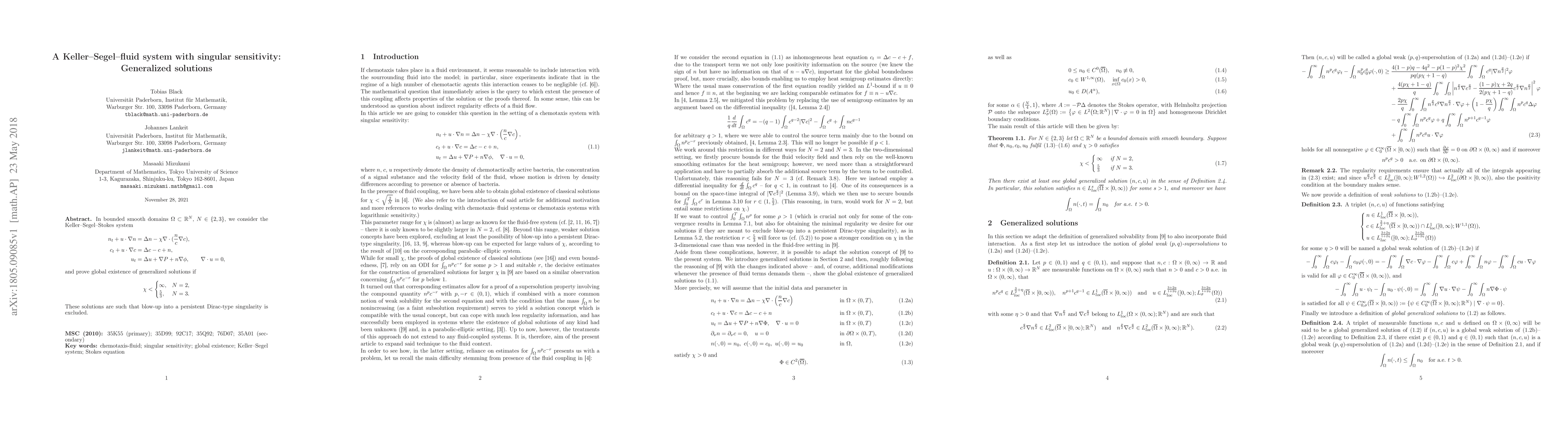 Researchers prove global existence of generalized solutions for a Keller-Segel-Stokes system with certain conditions on sensitivity, excluding blow-up into singularities in 2D and 3D domains.