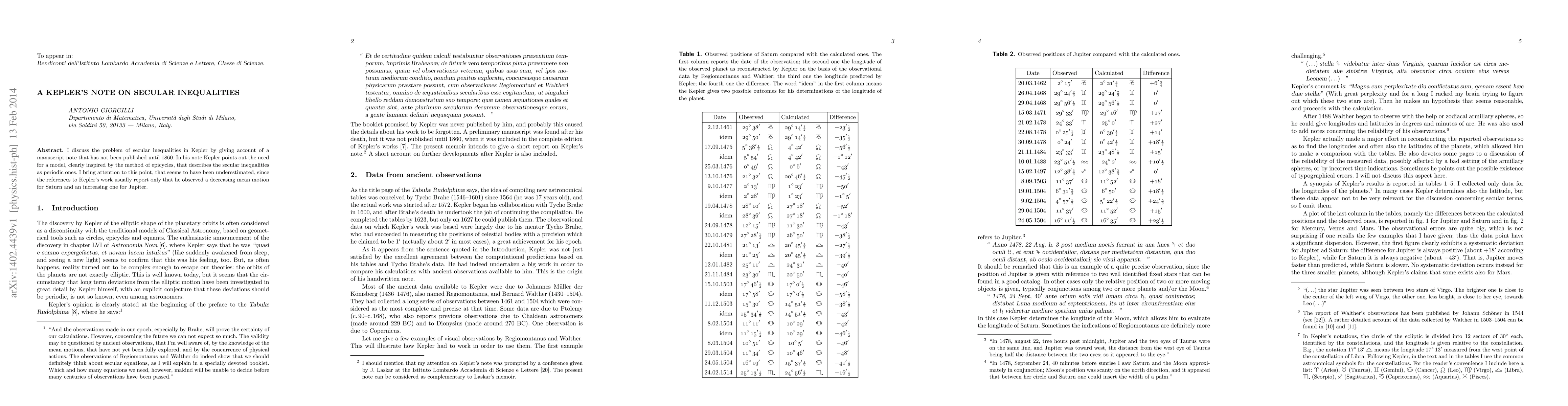 This paper examines a previously unpublished Kepler manuscript note from 1860, where Kepler proposes a model inspired by epicycles to describe secular inequalities, a point often overlooked in modern references that mainly note his observations of Saturn and Jupiter's mean motions.