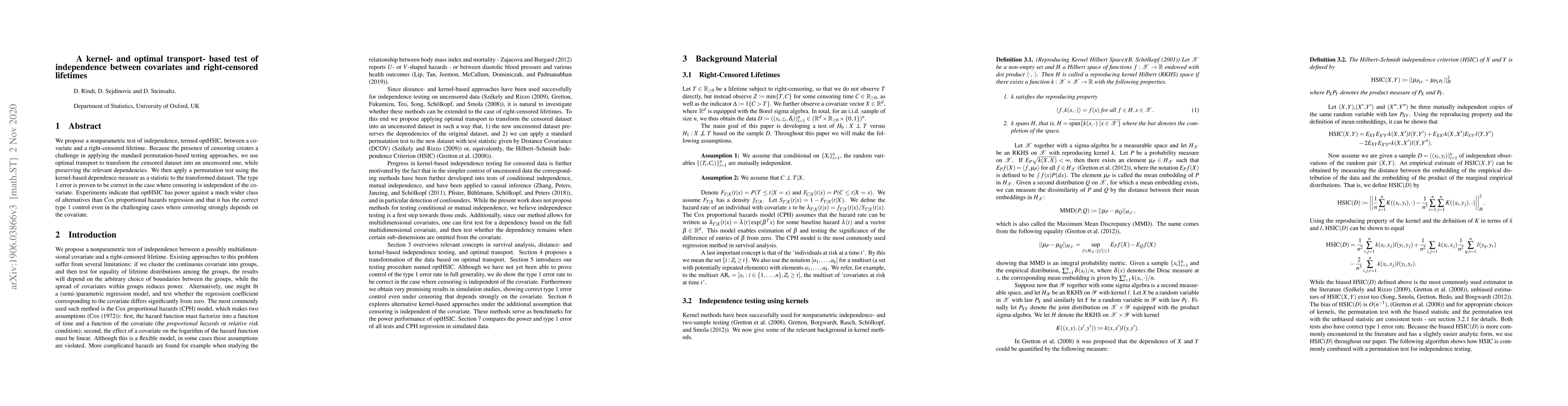 This paper introduces optHSIC, a nonparametric test for independence between covariates and right-censored lifetimes, using optimal transport to transform censored data into an uncensored form. The test maintains correct type 1 error under independent censoring and demonstrates superior power compared to Cox regression.