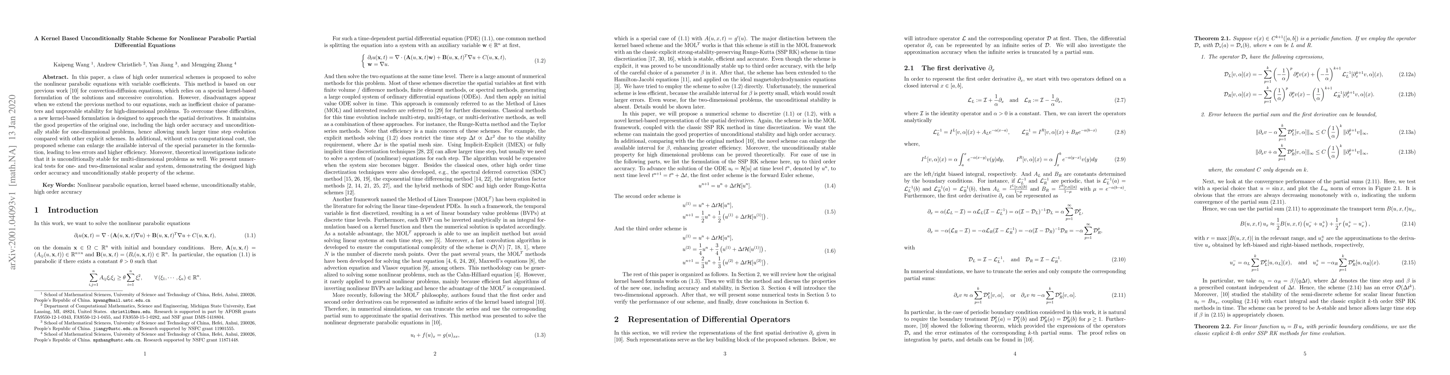 This paper proposes a new high-order, kernel-based numerical scheme for solving nonlinear parabolic partial differential equations with variable coefficients. The method is unconditionally stable, maintains high accuracy, and allows for larger time steps, while also being stable for multi-dimensional problems, as demonstrated by numerical tests.