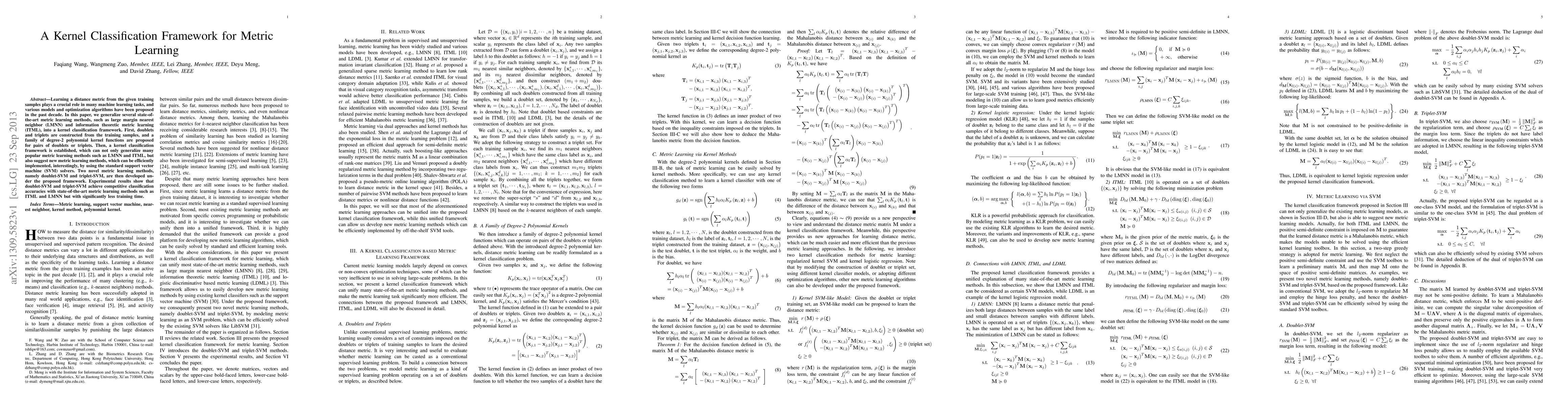 This paper presents a kernel classification framework for metric learning, generalizing methods like LMNN and ITML into a unified SVM-based approach using doublets and triplets. The proposed doublet-SVM and triplet-SVM achieve competitive accuracy with reduced training time compared to existing methods.
