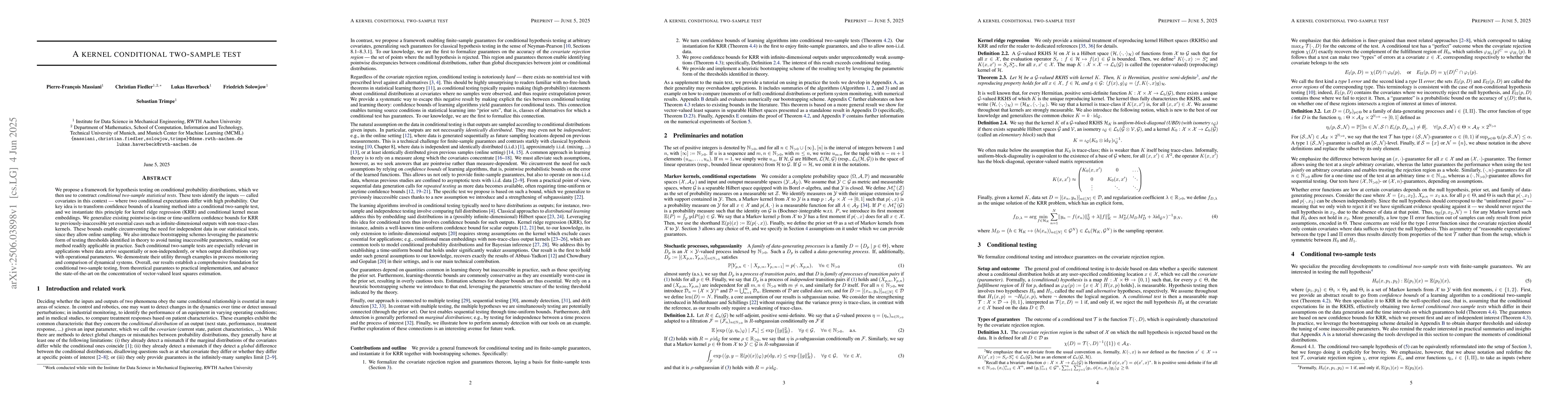 We propose a framework for hypothesis testing on conditional probability distributions, which we then use to construct conditional two-sample statistical tests. These tests identify the inputs -- called covariates in this context -- where two conditional expectations differ with high probability. Our key idea is to transform confidence bounds of a learning method into a conditional two-sample test, and we instantiate this principle for kernel ridge regression (KRR) and conditional kernel mean embeddings. We generalize existing pointwise-in-time or time-uniform confidence bounds for KRR to previously-inaccessible yet essential cases such as infinite-dimensional outputs with non-trace-class kernels. These bounds enable circumventing the need for independent data in our statistical tests, since they allow online sampling. We also introduce bootstrapping schemes leveraging the parametric form of testing thresholds identified in theory to avoid tuning inaccessible parameters, making our method readily applicable in practice. Such conditional two-sample tests are especially relevant in applications where data arrive sequentially or non-independently, or when output distributions vary with operational parameters. We demonstrate their utility through examples in process monitoring and comparison of dynamical systems. Overall, our results establish a comprehensive foundation for conditional two-sample testing, from theoretical guarantees to practical implementation, and advance the state-of-the-art on the concentration of vector-valued least squares estimation.
