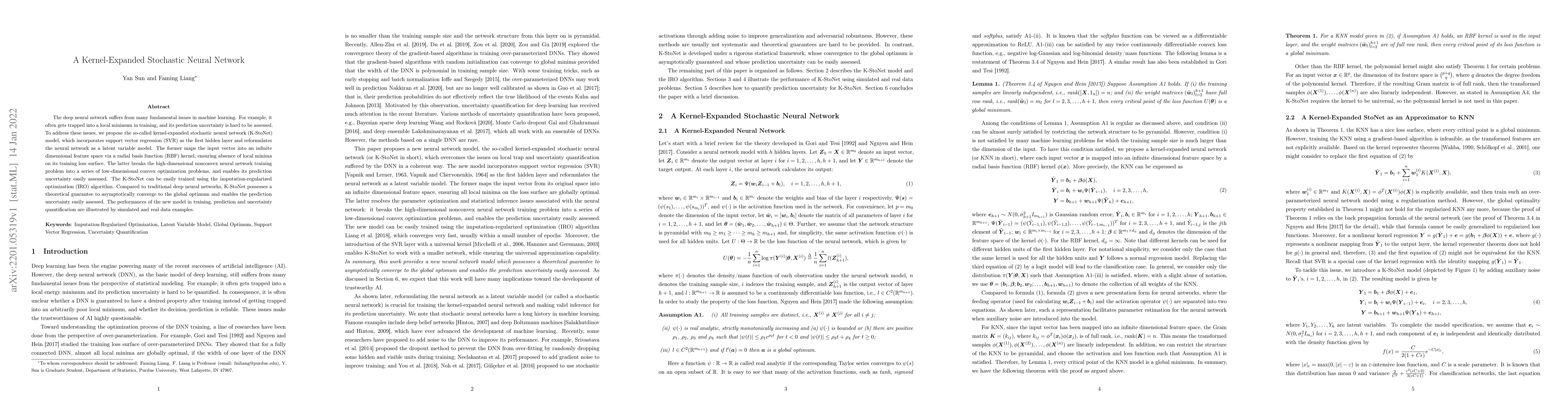The paper proposes a kernel-expanded stochastic neural network (K-StoNet) that uses support vector regression in the first hidden layer to map inputs into an infinite dimensional feature space, ensuring no local minima and enabling easy assessment of prediction uncertainty. The model is trained using the imputation-regularized optimization algorithm and shows improved performance over traditional deep neural networks.