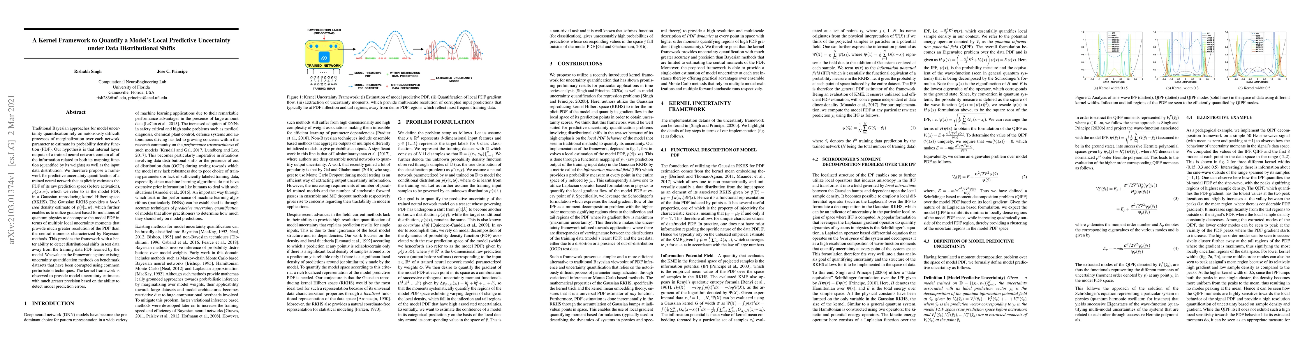 This paper proposes a kernel framework to quantify a model's local predictive uncertainty, leveraging internal layer outputs to estimate the probability density function of raw predictions in a Gaussian reproducing kernel Hilbert space. The framework provides higher resolution uncertainty moments, improving detection of distributional shifts in test data compared to traditional Bayesian methods.