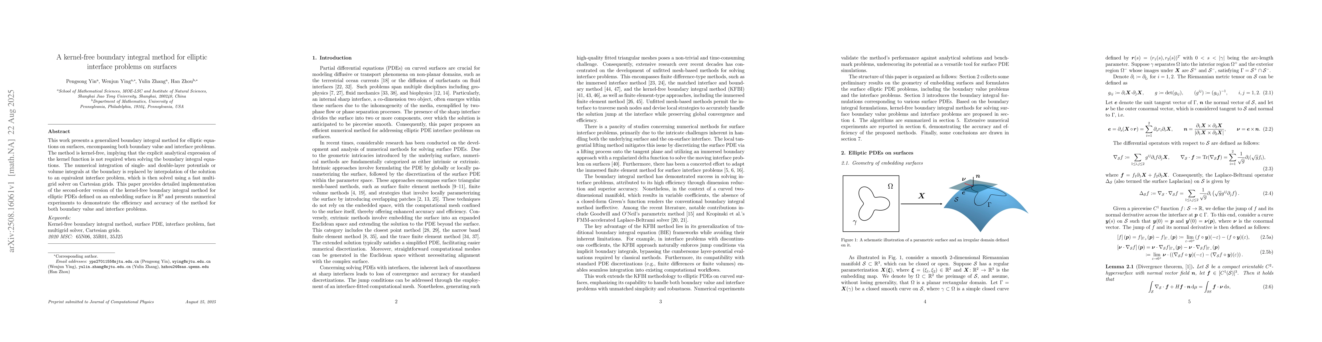 This work presents a generalized boundary integral method for elliptic equations on surfaces, encompassing both boundary value and interface problems. The method is kernel-free, implying that the explicit analytical expression of the kernel function is not required when solving the boundary integral equations. The numerical integration of single- and double-layer potentials or volume integrals at the boundary is replaced by interpolation of the solution to an equivalent interface problem, which is then solved using a fast multigrid solver on Cartesian grids. This paper provides detailed implementation of the second-order version of the kernel-free boundary integral method for elliptic PDEs defined on an embedding surface in $\mathbb{R}^3$ and presents numerical experiments to demonstrate the efficiency and accuracy of the method for both boundary value and interface problems.
