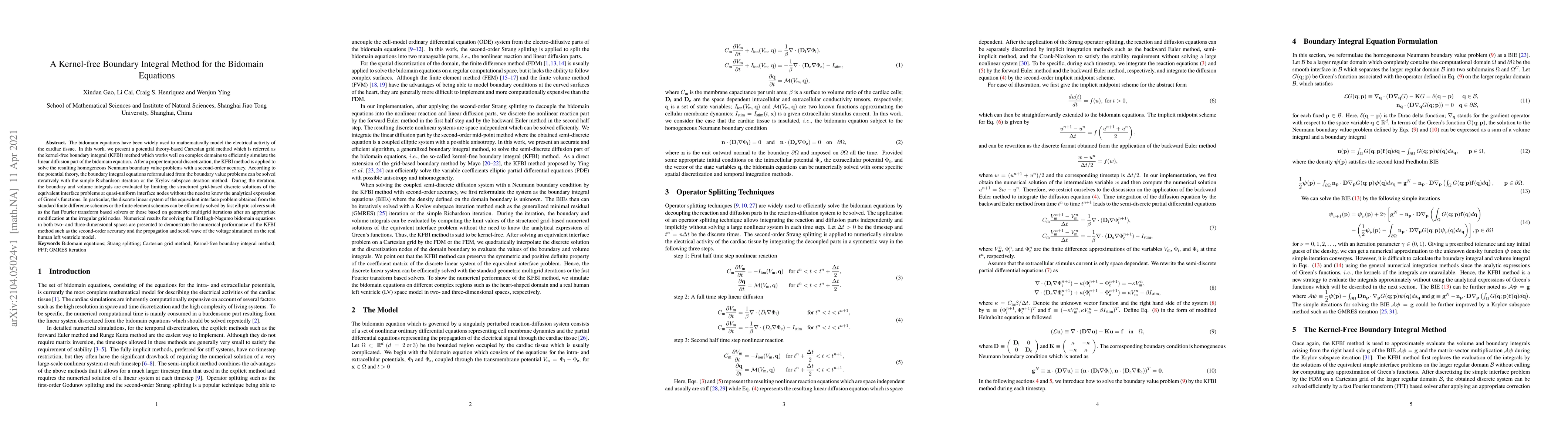 This paper introduces a kernel-free boundary integral method (KFBI) for the bidomain equations, which efficiently simulates the linear diffusion part on complex domains. The KFBI method achieves second-order accuracy and avoids the need for Green's functions, demonstrating effective numerical performance through simulations of the FitzHugh-Nagumo bidomain equations in two and three dimensions.
