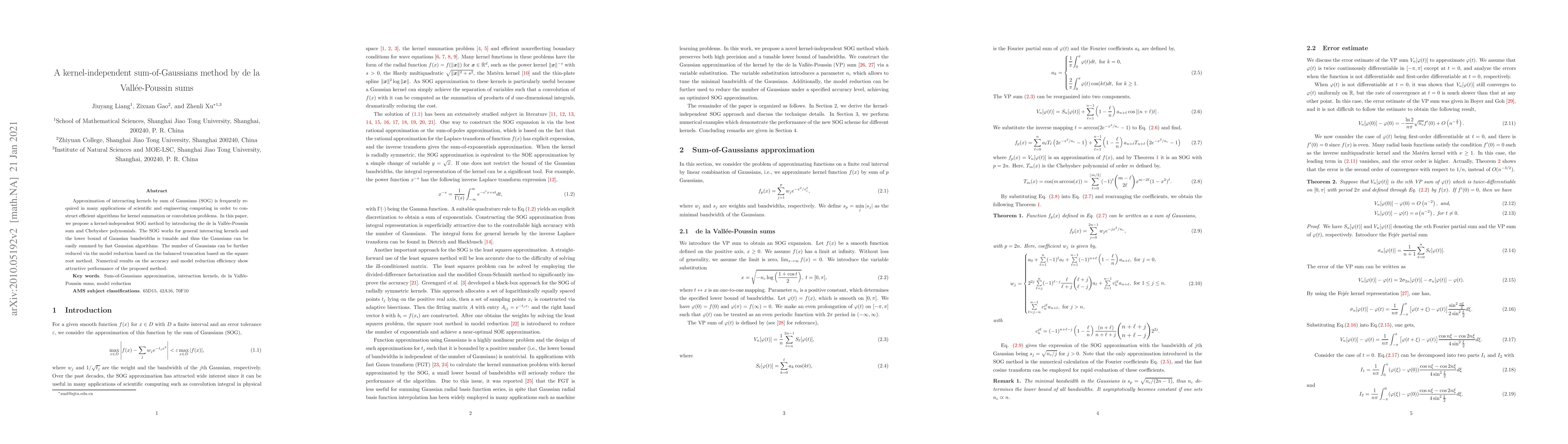 This paper proposes a kernel-independent sum-of-Gaussians (SOG) method using de la Vallée-Poussin sums and Chebyshev polynomials for efficient kernel summation. The method allows tunable Gaussian bandwidths and model reduction via balanced truncation, demonstrating good accuracy and efficiency.