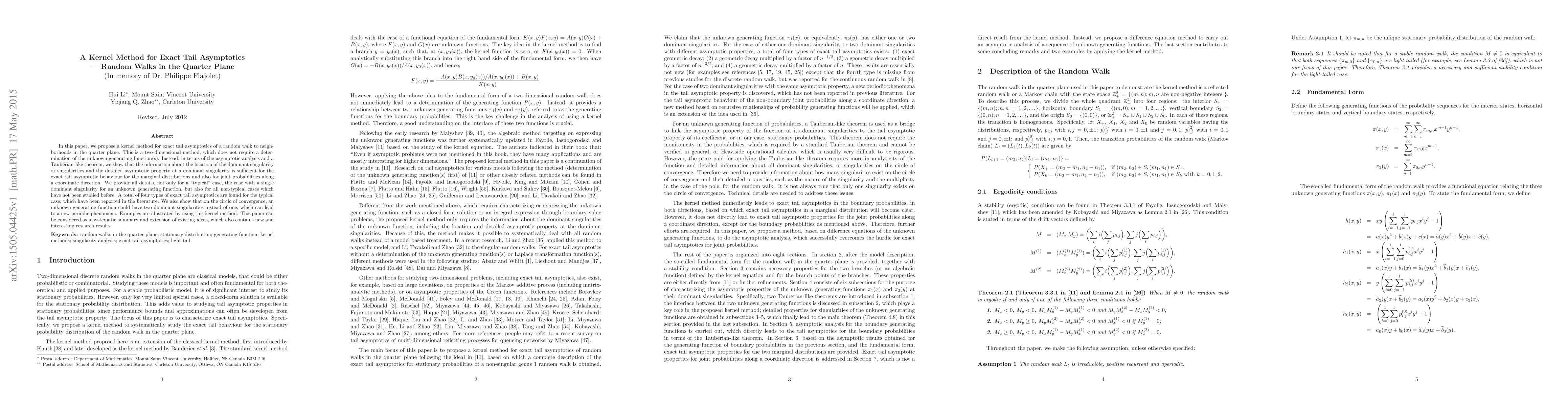 This paper proposes a novel kernel method for exact tail asymptotics of a random walk in the quarter plane, eliminating the need for determining unknown generating functions. It provides detailed asymptotic properties and identifies four types of exact tail asymptotics, including new periodic phenomena arising from multiple dominant singularities.