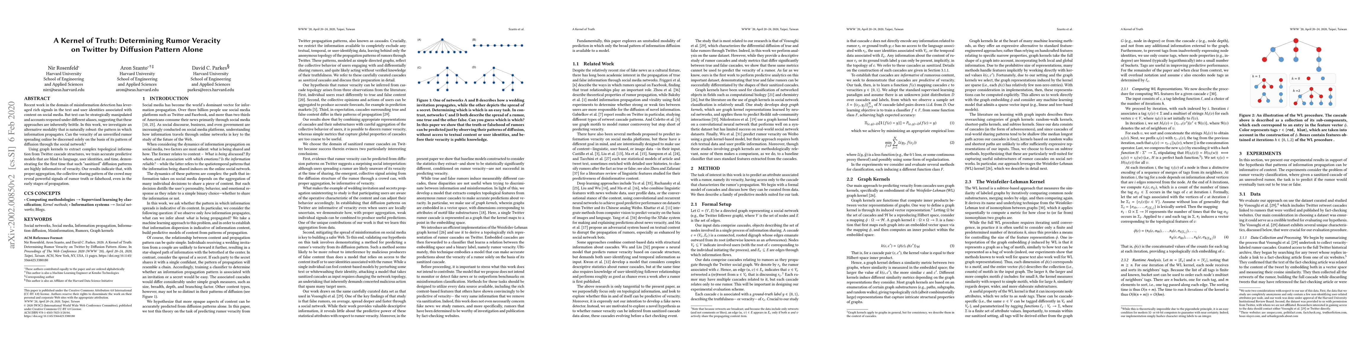 Recent work in the domain of misinformation detection has leveraged rich signals in the text and user identities associated with content on social media. But text can be strategically manipulated and accounts reopened under different aliases, suggesting that these approaches are inherently brittle. In this work, we investigate an alternative modality that is naturally robust: the pattern in which information propagates. Can the veracity of an unverified rumor spreading online be discerned solely on the basis of its pattern of diffusion through the social network? Using graph kernels to extract complex topological information from Twitter cascade structures, we train accurate predictive models that are blind to language, user identities, and time, demonstrating for the first time that such "sanitized" diffusion patterns are highly informative of veracity. Our results indicate that, with proper aggregation, the collective sharing pattern of the crowd may reveal powerful signals of rumor truth or falsehood, even in the early stages of propagation.