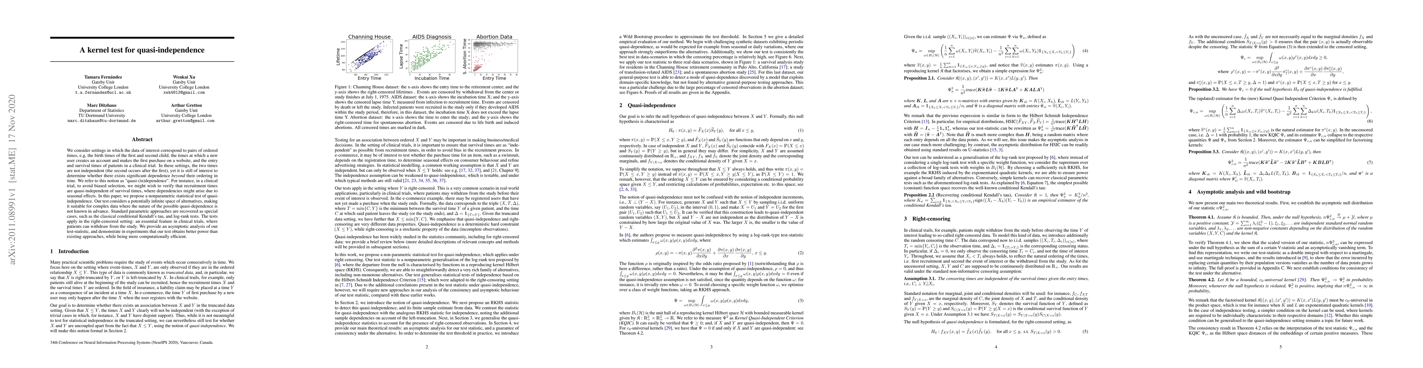 We consider settings in which the data of interest correspond to pairs of ordered times, e.g, the birth times of the first and second child, the times at which a new user creates an account and makes the first purchase on a website, and the entry and survival times of patients in a clinical trial. In these settings, the two times are not independent (the second occurs after the first), yet it is still of interest to determine whether there exists significant dependence {\em beyond} their ordering in time. We refer to this notion as "quasi-(in)dependence". For instance, in a clinical trial, to avoid biased selection, we might wish to verify that recruitment times are quasi-independent of survival times, where dependencies might arise due to seasonal effects. In this paper, we propose a nonparametric statistical test of quasi-independence. Our test considers a potentially infinite space of alternatives, making it suitable for complex data where the nature of the possible quasi-dependence is not known in advance. Standard parametric approaches are recovered as special cases, such as the classical conditional Kendall's tau, and log-rank tests. The tests apply in the right-censored setting: an essential feature in clinical trials, where patients can withdraw from the study. We provide an asymptotic analysis of our test-statistic, and demonstrate in experiments that our test obtains better power than existing approaches, while being more computationally efficient.