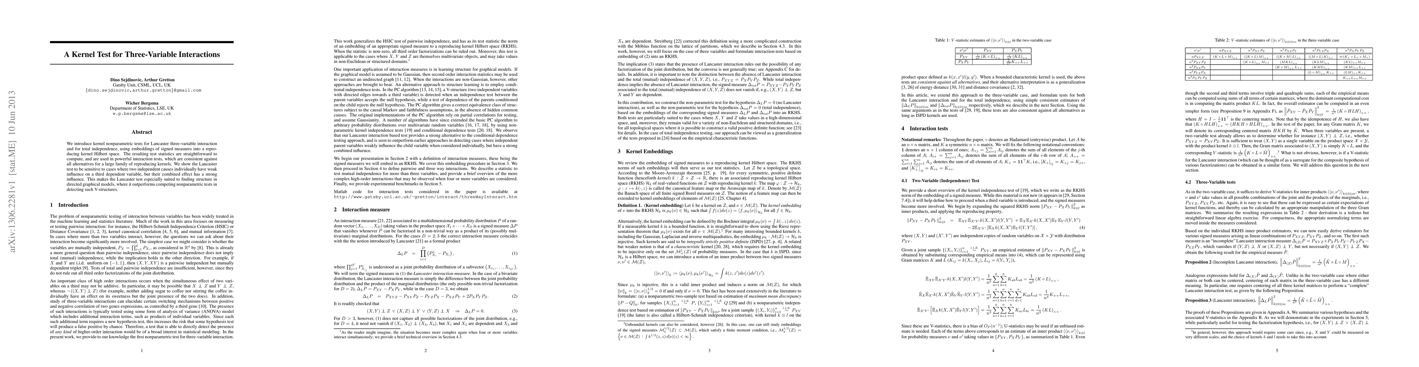 This paper introduces kernel nonparametric tests for detecting three-variable interactions and total independence, showing the Lancaster test's effectiveness in identifying combined effects of independent variables on a dependent variable. The proposed tests are consistent and outperform other methods in detecting V-structures in directed graphical models.