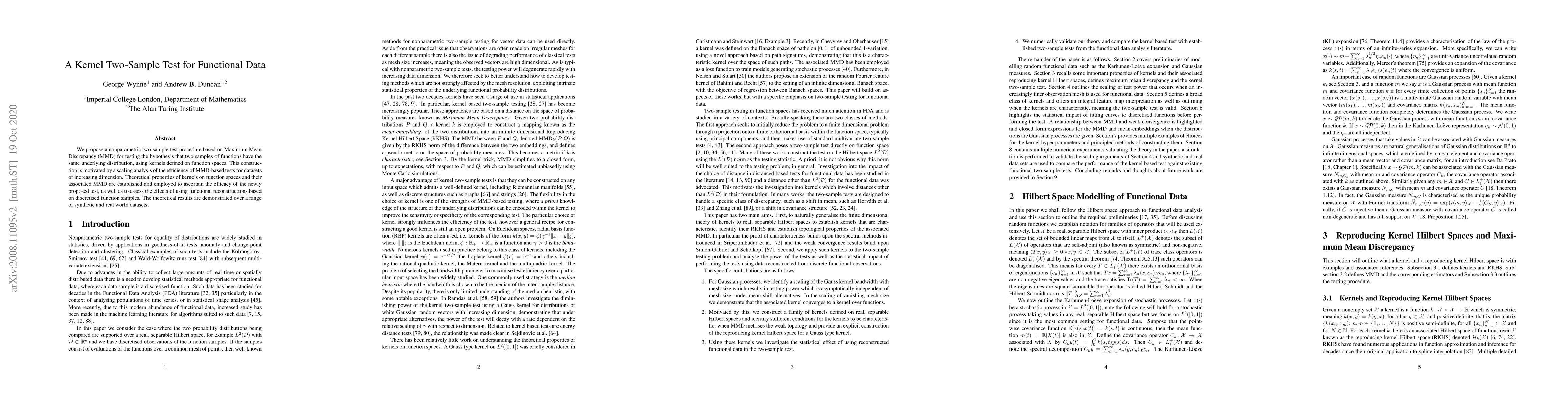 This paper proposes a nonparametric two-sample test based on Maximum Mean Discrepancy (MMD) for functional data, establishing theoretical properties of kernels on function spaces and evaluating the test's efficacy on synthetic and real datasets. The method aims to determine if two samples of functions share the same underlying distribution.