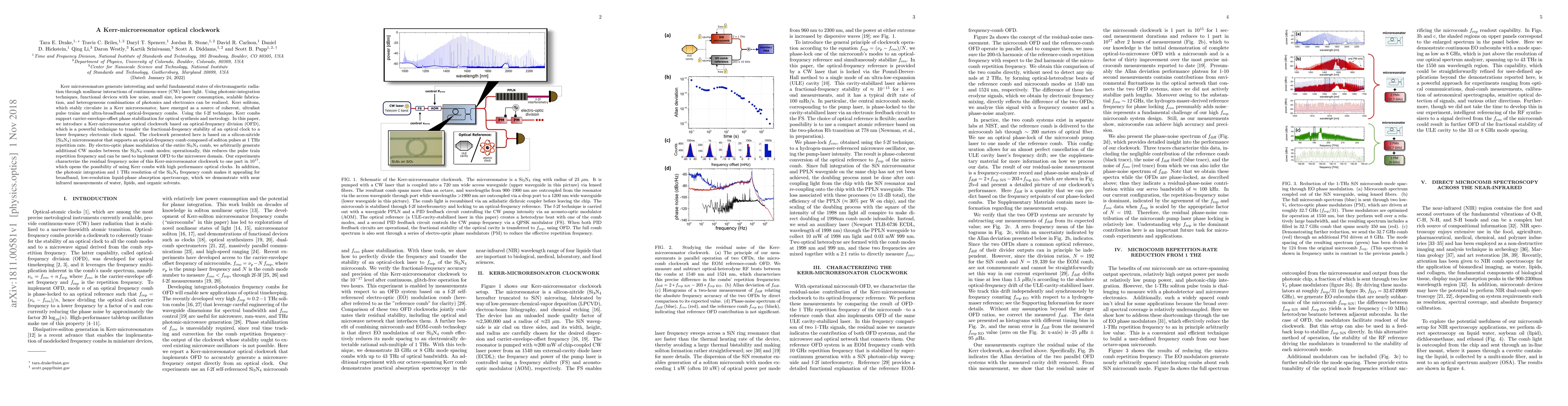 Kerr microresonators generate interesting and useful fundamental states of electromagnetic radiation through nonlinear interactions of continuous-wave (CW) laser light. Using photonic-integration techniques, functional devices with low noise, small size, low-power consumption, scalable fabrication, and heterogeneous combinations of photonics and electronics can be realized. Kerr solitons, which stably circulate in a Kerr microresonator, have emerged as a source of coherent, ultrafast pulse trains and ultra-broadband optical-frequency combs. Using the f-2f technique, Kerr combs support carrier-envelope-offset phase stabilization for optical synthesis and metrology. In this paper, we introduce a Kerr-microresonator optical clockwork based on optical-frequency division (OFD), which is a powerful technique to transfer the fractional-frequency stability of an optical clock to a lower frequency electronic clock signal. The clockwork presented here is based on a silicon-nitride (Si$_3$N$_4$) microresonator that supports an optical-frequency comb composed of soliton pulses at 1 THz repetition rate. By electro-optic phase modulation of the entire Si$_3$N$_4$ comb, we arbitrarily generate additional CW modes between the Si$_3$N$_4$ comb modes; operationally, this reduces the pulse train repetition frequency and can be used to implement OFD to the microwave domain. Our experiments characterize the residual frequency noise of this Kerr-microresonator clockwork to one part in $10^{17}$, which opens the possibility of using Kerr combs with high performance optical clocks. In addition, the photonic integration and 1 THz resolution of the Si$_3$N$_4$ frequency comb makes it appealing for broadband, low-resolution liquid-phase absorption spectroscopy, which we demonstrate with near infrared measurements of water, lipids, and organic solvents.
