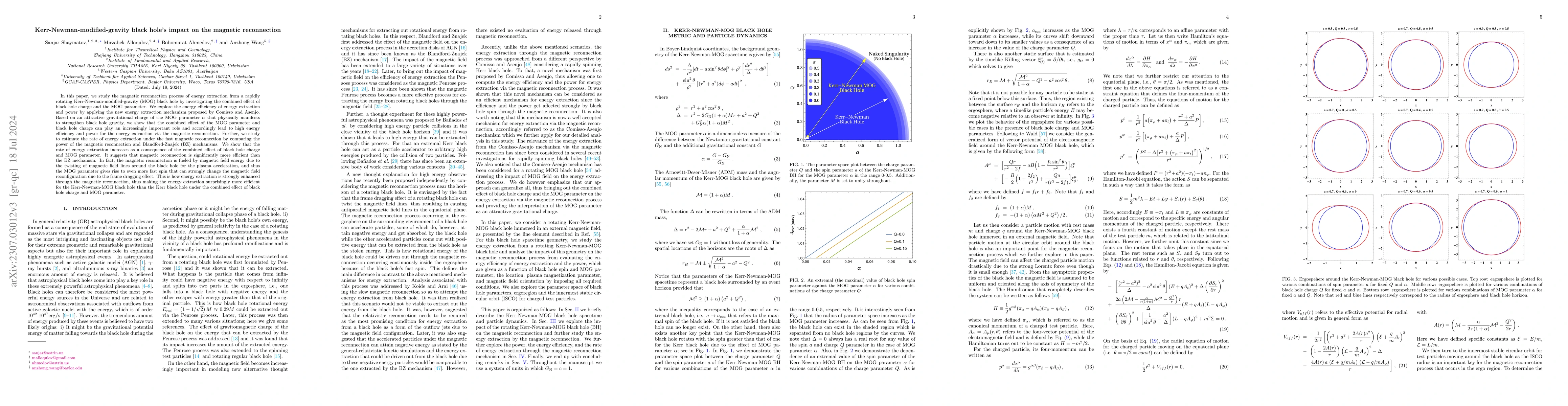 This paper investigates the magnetic reconnection process for energy extraction from a Kerr-Newman-MOG black hole, demonstrating that the combined effect of black hole charge and MOG parameter significantly enhances energy efficiency and power. The study finds magnetic reconnection to be more efficient than the Blandford-Znajek mechanism due to the MOG parameter's influence on magnetic field reconfiguration and frame dragging.